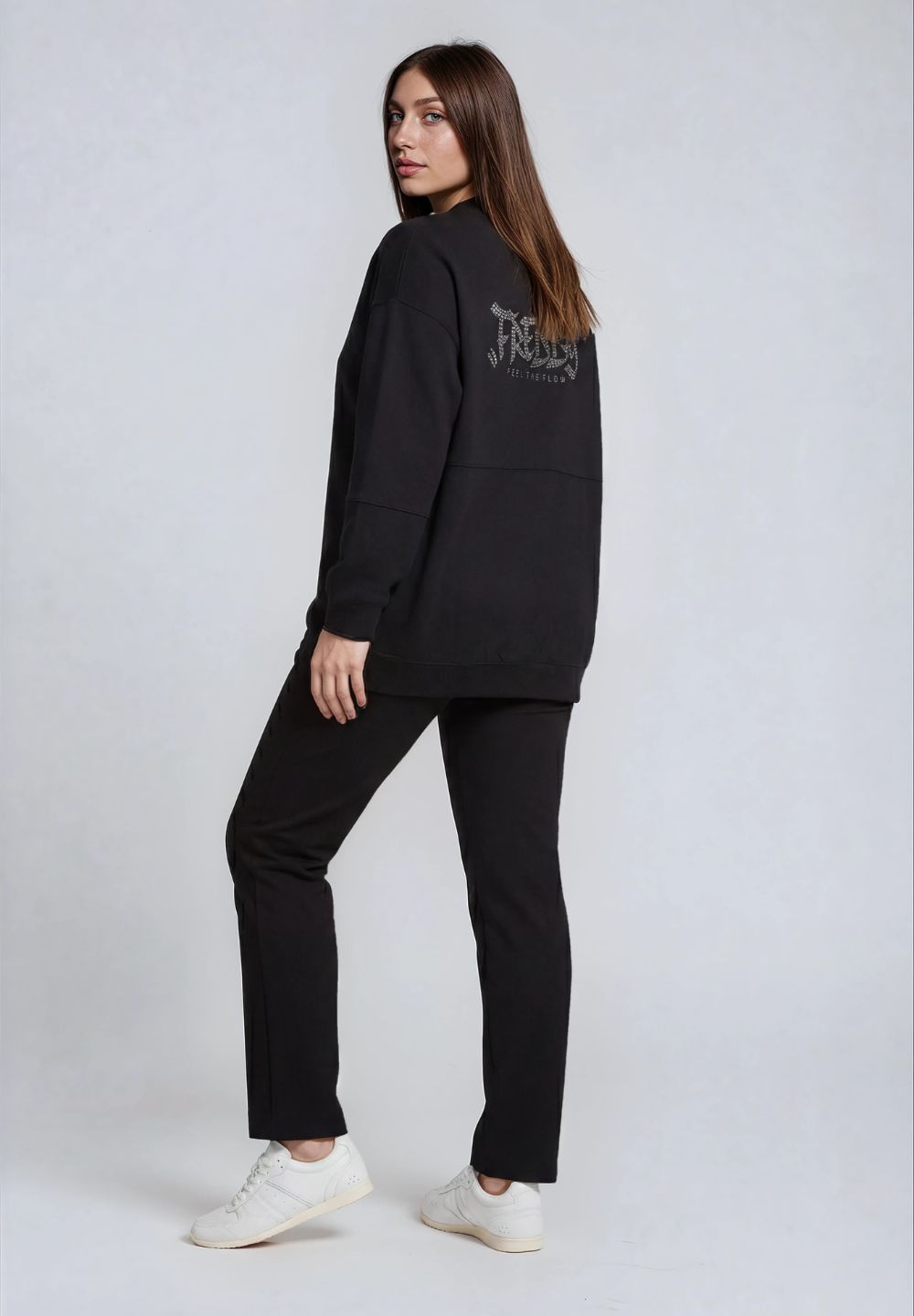 Oversize zip sweatshirt made of soft, enzyme-treated French terry fabric for comfort and durability. The under-the-hips length and ribbed hem provide a relaxed look, and the bomber-style ribbed neckline and ribbed cuffs on the sleeves add a dynamic touch. The large “FREDDY FEEL THE FLOW” print on the back, made in street art style and embellished with studs, is the heart of this garment, evoking the energy of break dancing and urban style. Besom pockets for extra convenience.