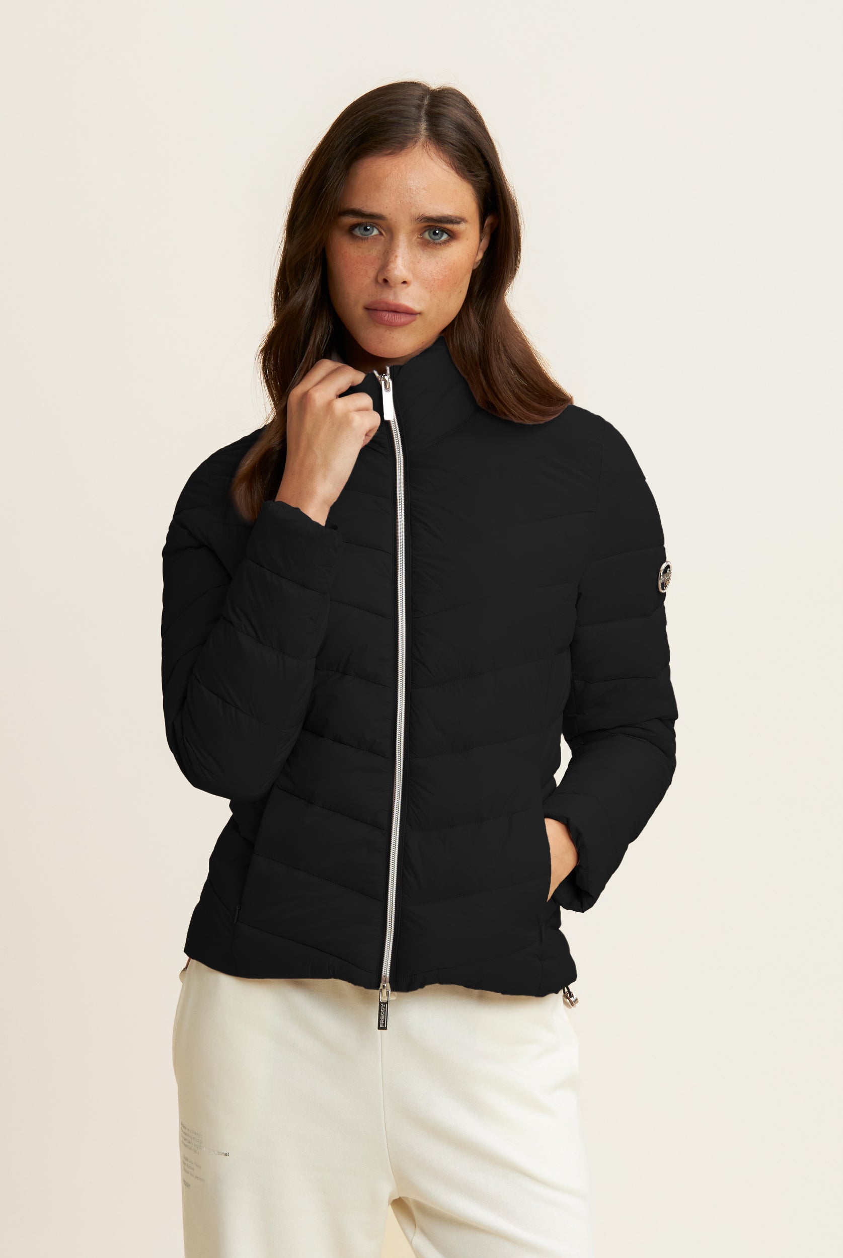 Women's regular fit down jacket with horizontal bands and length just below the waist, perfect for tackling the colder days. The turtleneck and full double-slide zip fastening provide optimal protection from the cold. The adjustable drawstring waist allows for a customised fit. Glossy nylon exterior with water repellent treatment and animal-friendly fake-down quilting, warm and effective even in wet conditions. Feminine details such as the rhinestone logo on the left sleeve and practical front zipped pockets complete the look.