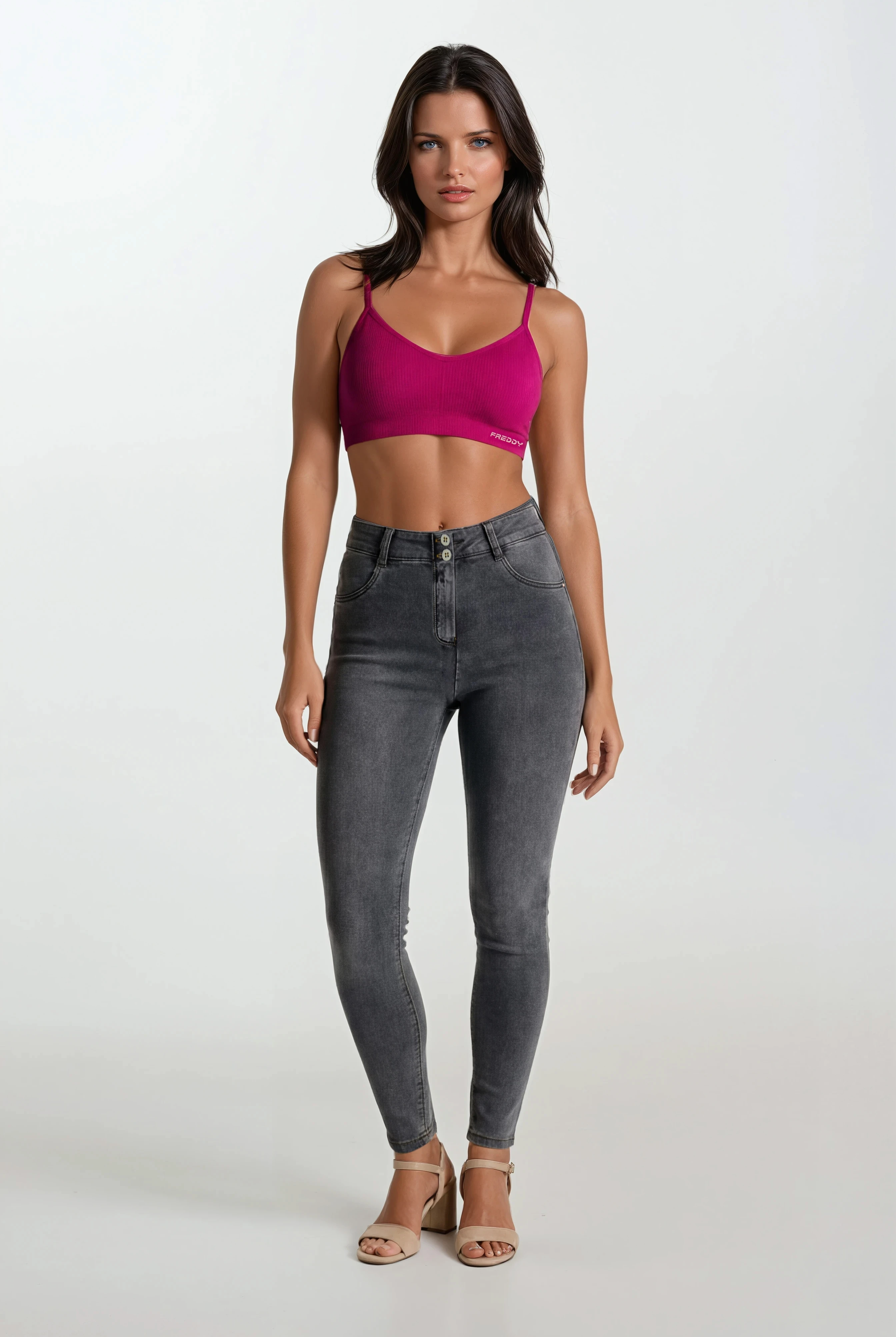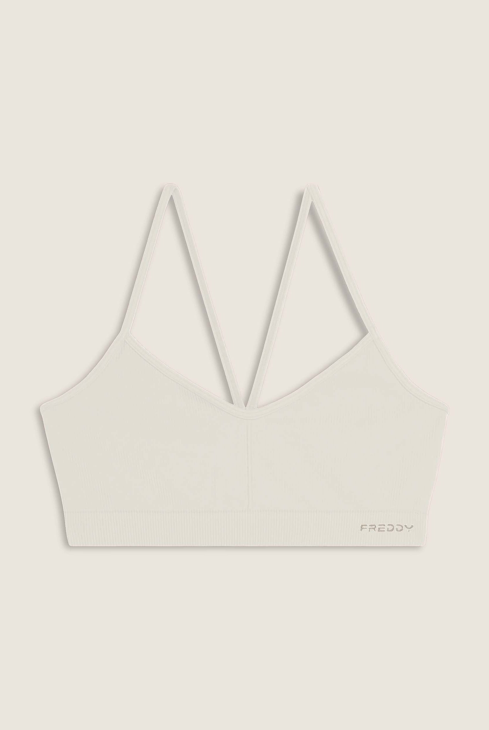 Medium support sports bra, ideal for variable intensity training. Made from seamless ribbed fabric, it seamlessly follows the contours of the body to provide total comfort. The design includes a wide neckline and thin shoulder straps crossed at the back, with a small FREDDY jacquard logo on the underbust band.