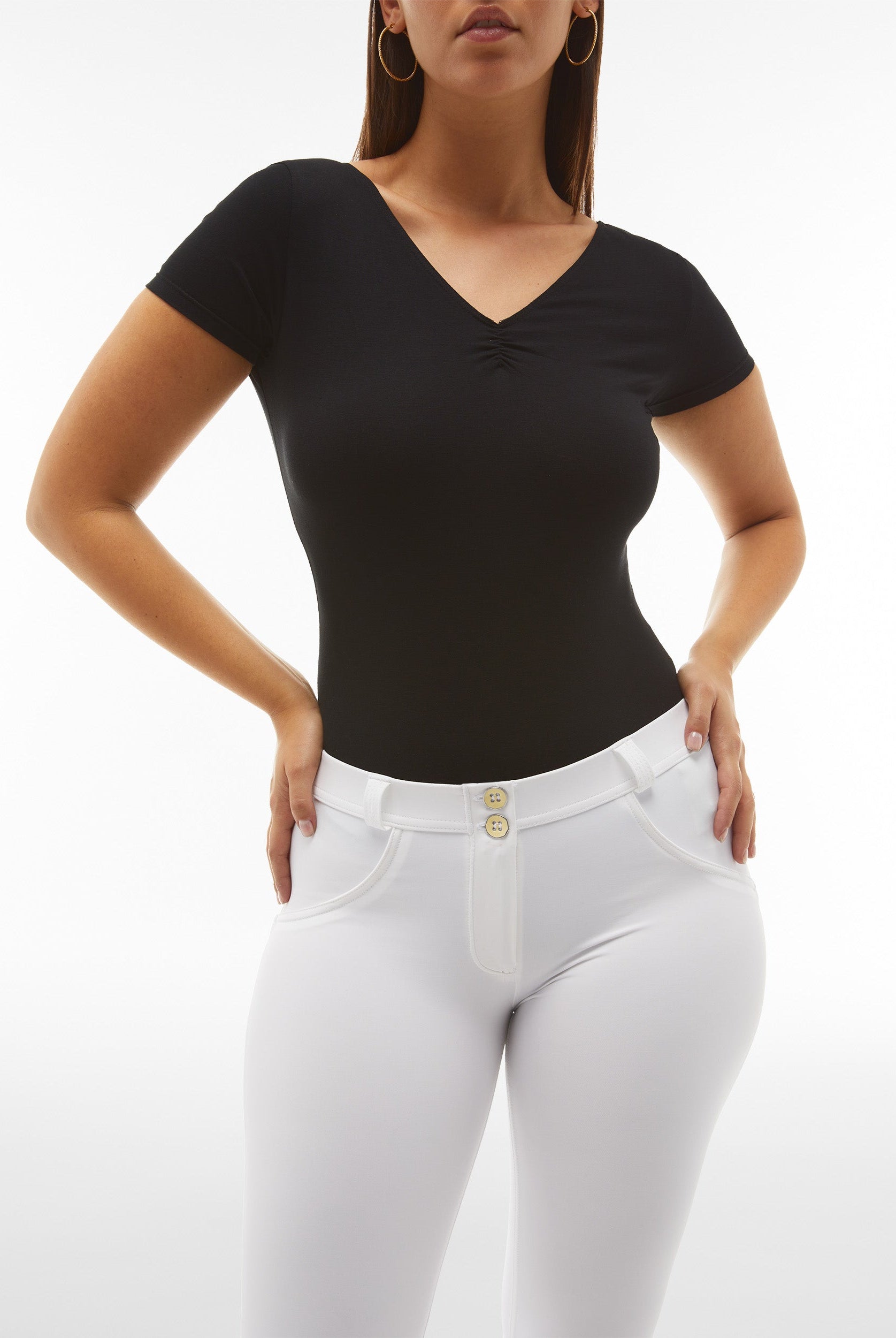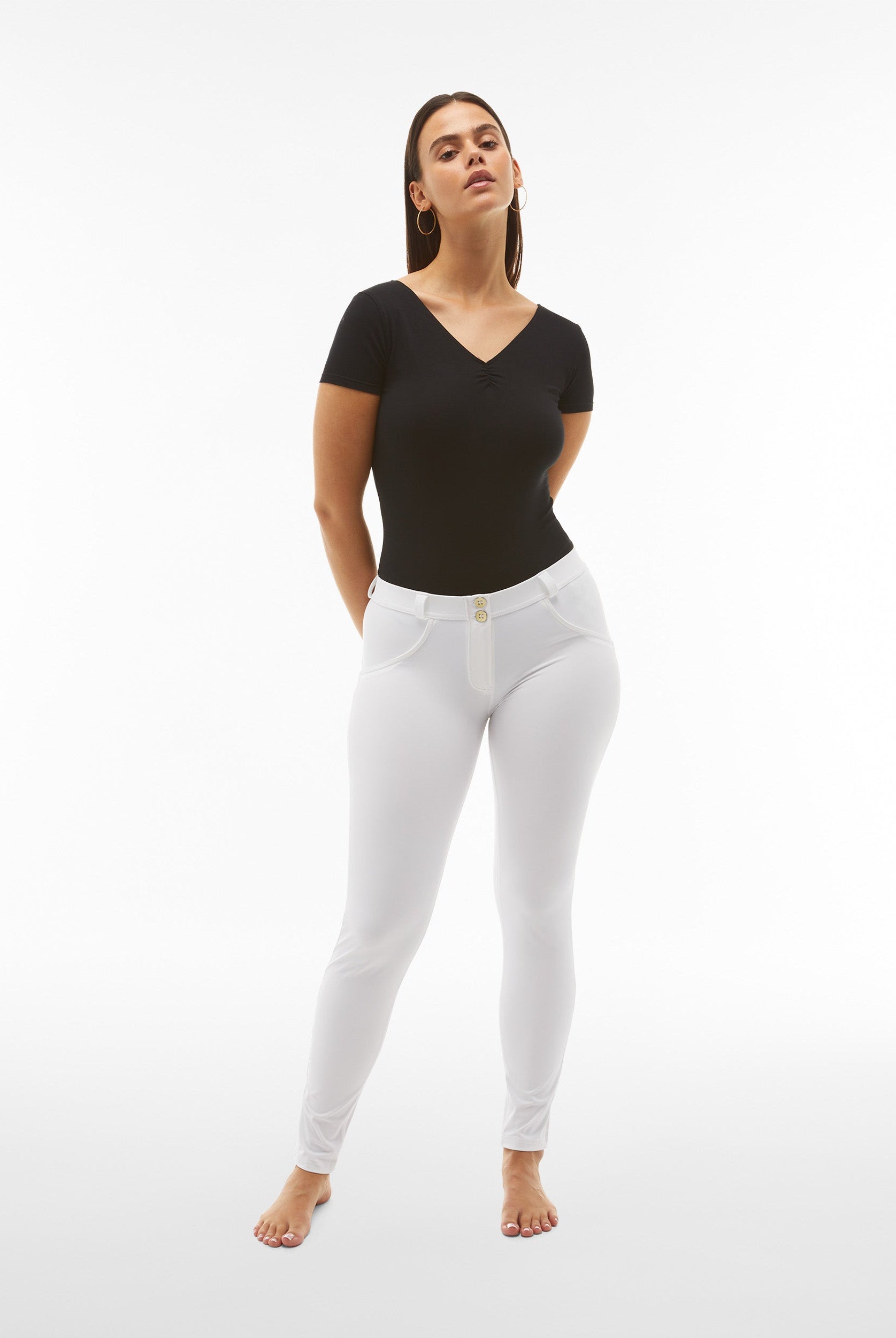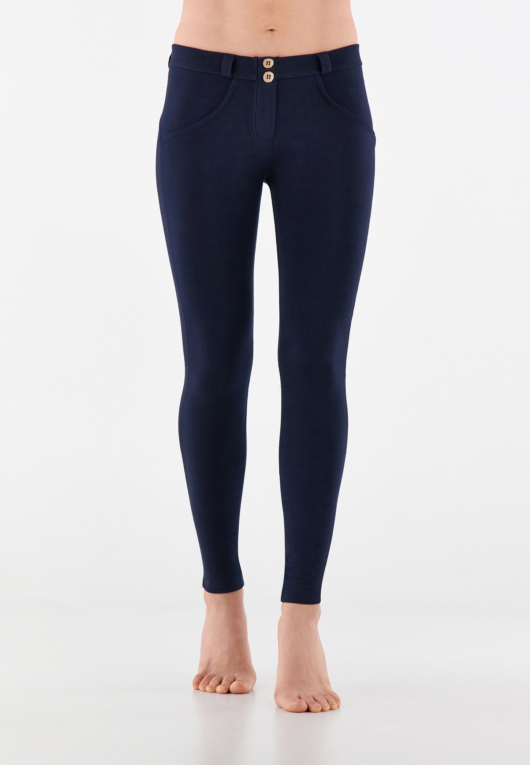 Die Mid-Waist-Modelle sitzen zwischen der Taille und dem Bauchnabel. Alle unsere mittlere Jeans haben vorne drei Freddy-typische Knöpfe. Sie sind etwas höher als unsere Regular-Waist-Hosen, aber nicht ganz so hoch, wie die High-Waist-Modelle. Sie haben einen bequemen, hohen Bund ohne Silikonstreifen, und die Knöpfe sorgen für einen perfekten Sitz. Jeans in Mid Waist eignen sich vor allem für kurvigere Frauen, die mehr Stütze und Form für den Bauch und die Taille möchten. Zusätzlich zaubern die Hosen natürlich den perfekten Po.