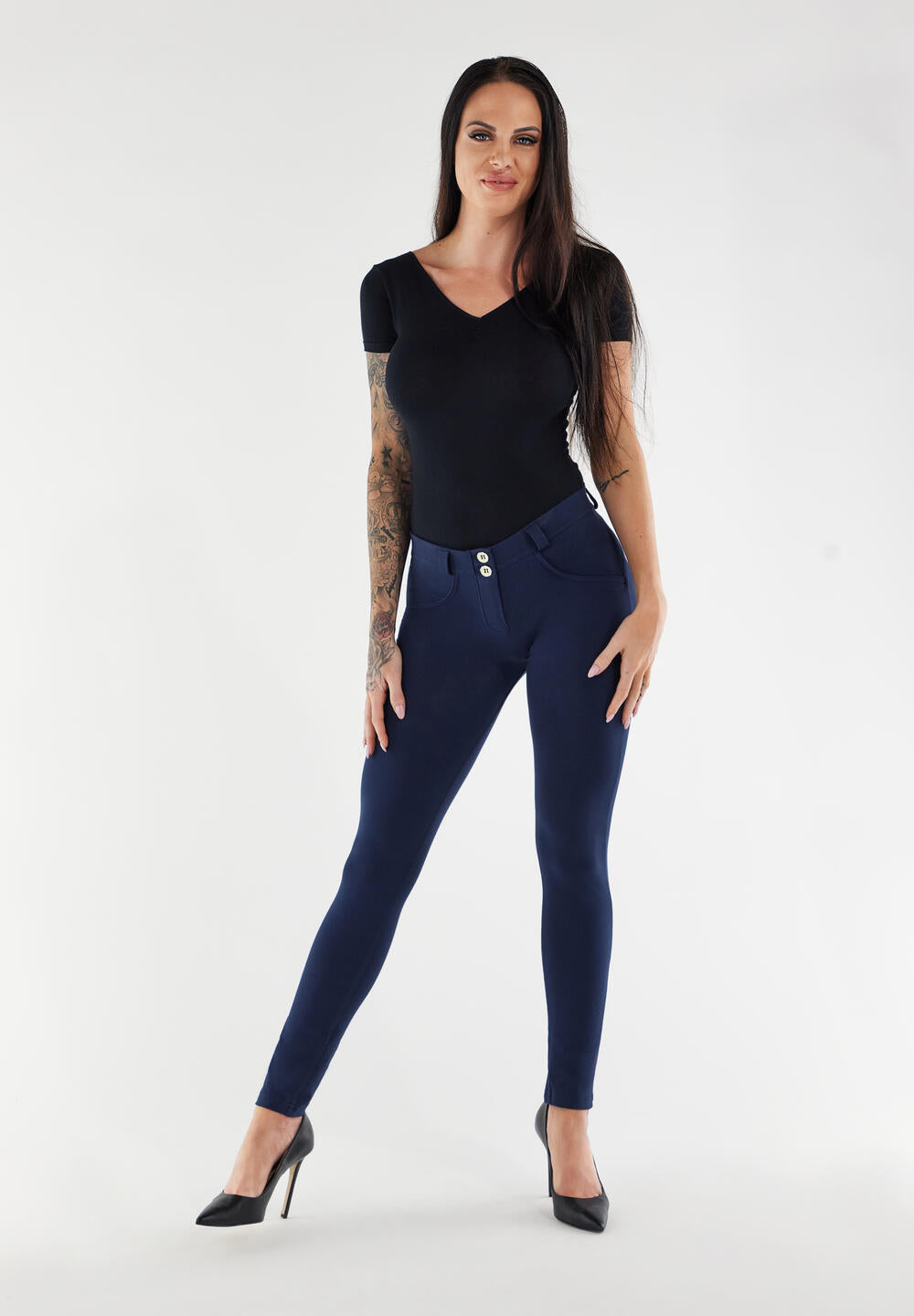 Hosen in Denim-Optik kombinieren den Stil von Push up Jeans mit dem Komfort von Leggings. Unsere Denims sitzen wirklich wie eine zweite Haut und betonen dabei deine natürlichen Kurven. Obwohl diese Jeggings wie echte Jeans aussehen, sind sie extrem elastisch und genauso bequem wie deine Lieblingsleggings. Dank des Silikonbundes an der Taille rutscht die Hose nicht, und du brauchst keinen Gürtel. Eine Jeanshose ist eine echte Alleskönnerin, die du immer und überall tragen kannst. Wir bieten unsere Denims in zahlreichen Farben und mit unterschiedlichen Details, so dass du genau den perfekten Style für dich findest. Ob in voller Beinlänge oder Knöchellänge, mit hoher oder niedriger Leibhöhe, Freddys sitzen immer perfekt!