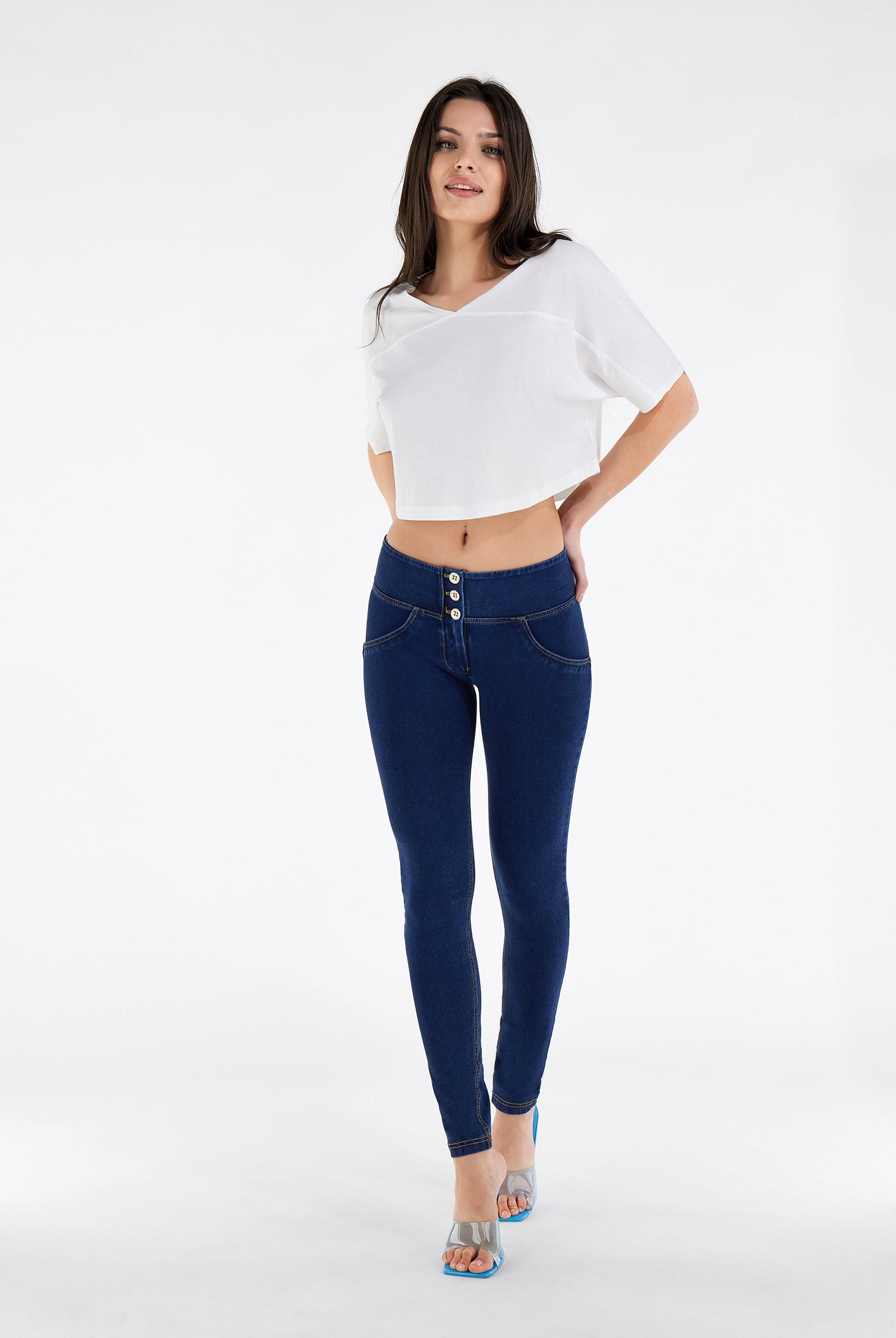 Die Mid-Waist-Modelle sitzen zwischen der Taille und dem Bauchnabel. Alle unsere mittlere Jeans haben vorne drei Freddy-typische Knöpfe. Sie sind etwas höher als unsere Regular-Waist-Hosen, aber nicht ganz so hoch, wie die High-Waist-Modelle. Sie haben einen bequemen, hohen Bund ohne Silikonstreifen, und die Knöpfe sorgen für einen perfekten Sitz. Jeans in Mid Waist eignen sich vor allem für kurvigere Frauen, die mehr Stütze und Form für den Bauch und die Taille möchten. Zusätzlich zaubern die Hosen natürlich den perfekten Po.