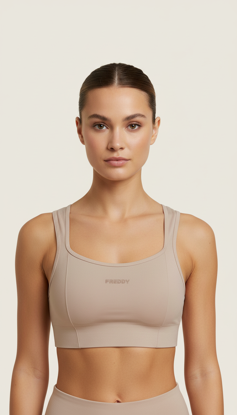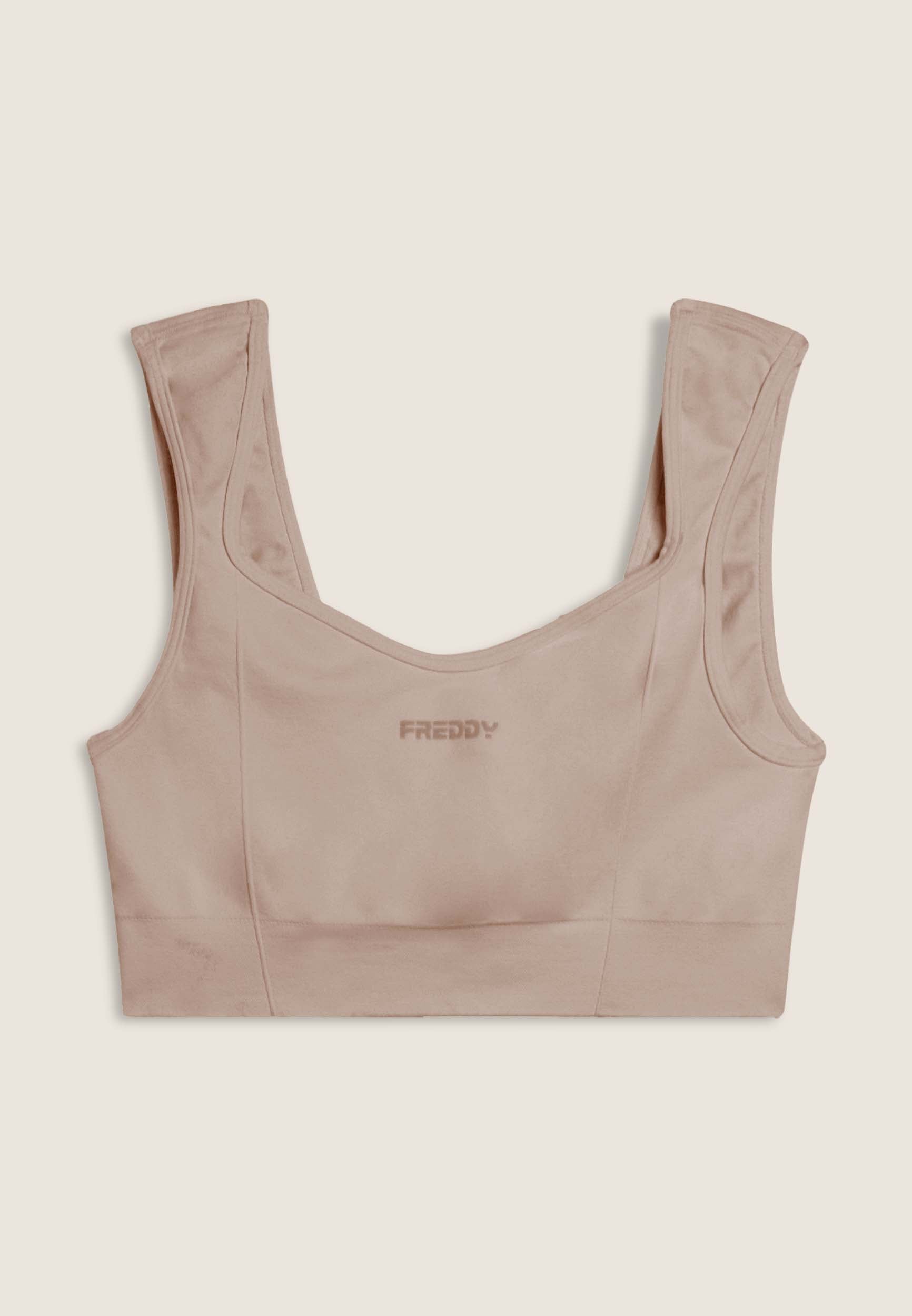 With its feminine and comfortable design, this light support sports top is perfect for yoga and low intensity activities. Sweetheart neckline at the front and square neckline at the back with regular shoulder straps. The nylon jersey performance fabric is soft, breathable and lightweight, with a small FREDDY contrasting logo on the front.