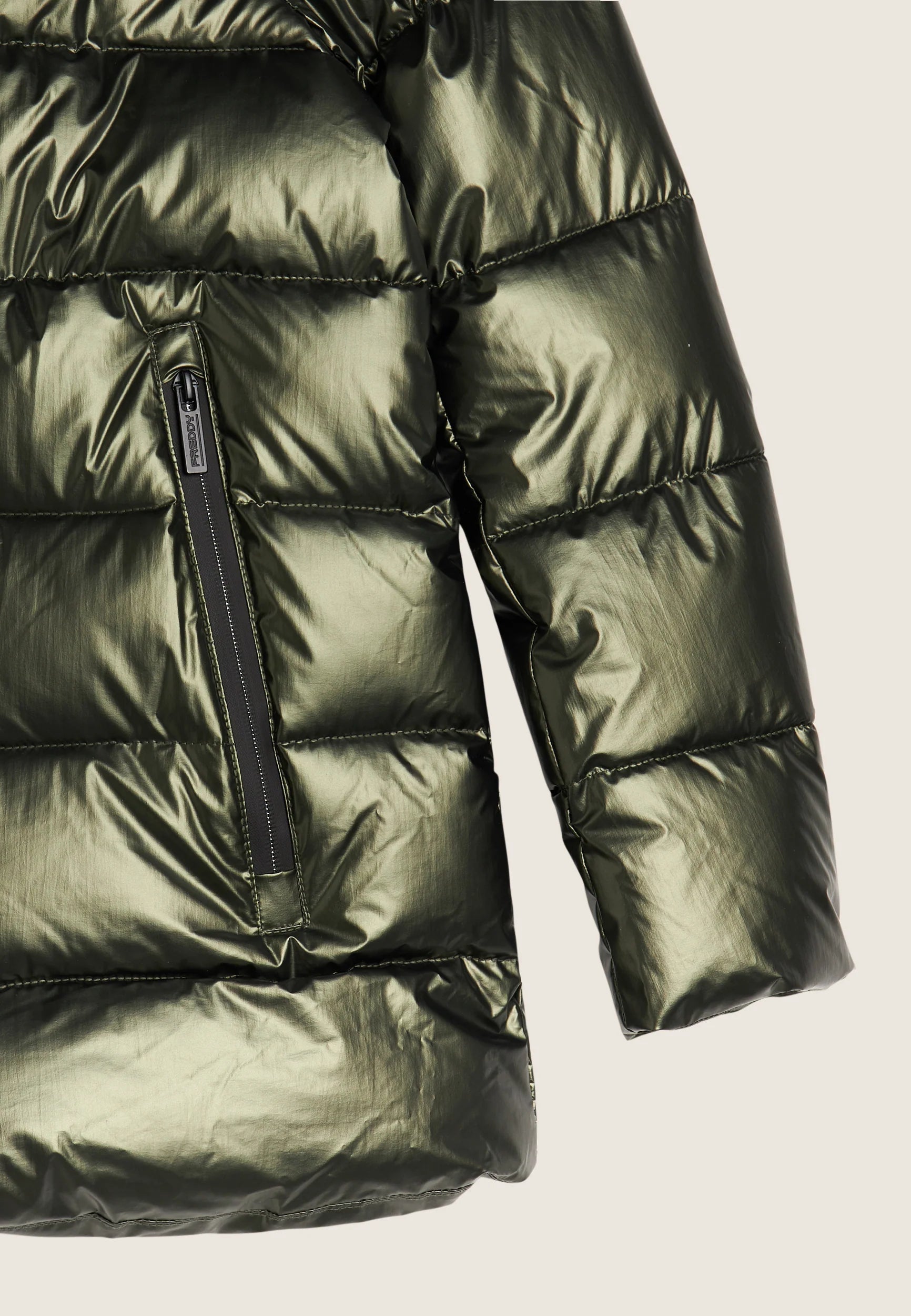 Women's glossy down jacket with protective hood and drawstring