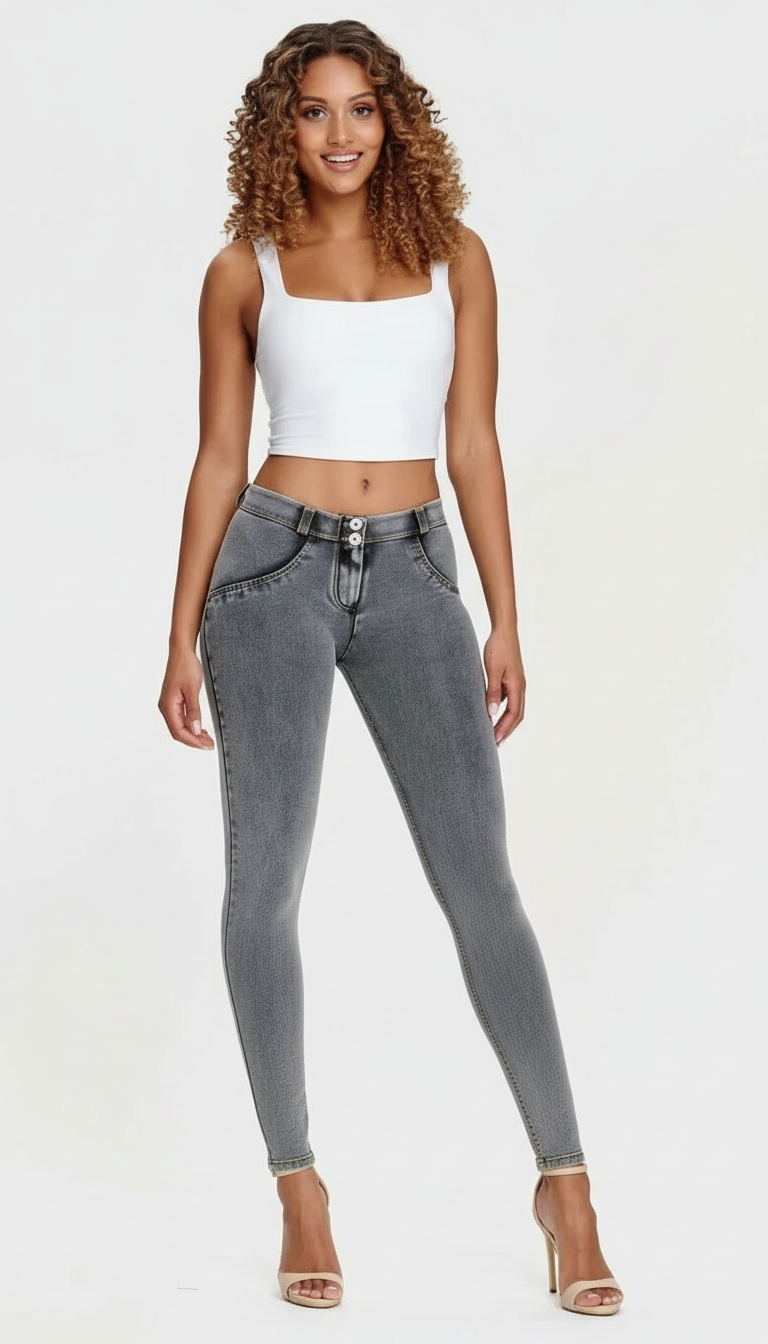 Erlebe die unschlagbare Passform und das einzigartige Tragegefühl der WR.UP® Pants in Grau. Sie kombinieren eine schmale Skinny-Passform, die deine Kurven wunderbar zur Geltung bringt. Dazu kommt einer zeitlosen vollen Länge, perfekt für das ganze Jahr. Die bequeme mittlere Leibhöhe sorgt für Komfort im Alltag und rundet den Look perfekt ab. Gefertigt entworfen mit einem Stretch-Denim-Effekt-Material für authentischen Stil und leichte Bewegung. Dank der patentierten WR.UP®-Technologie wird deine Silhouette auf natürliche Weise geformt und perfekt in Szene gesetzt. Dein perfekter Begleiter für unzählige Gelegenheiten, von lässig bis schick.