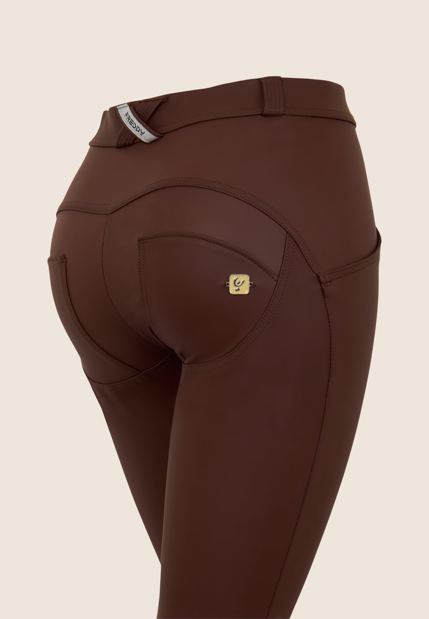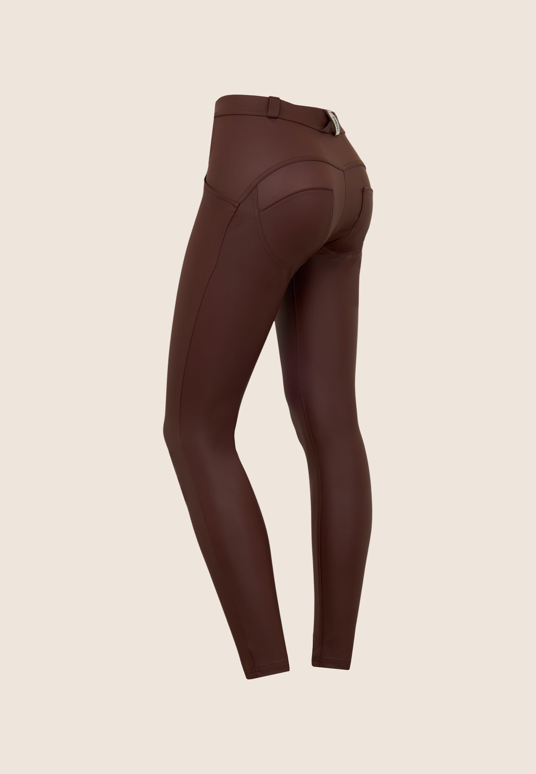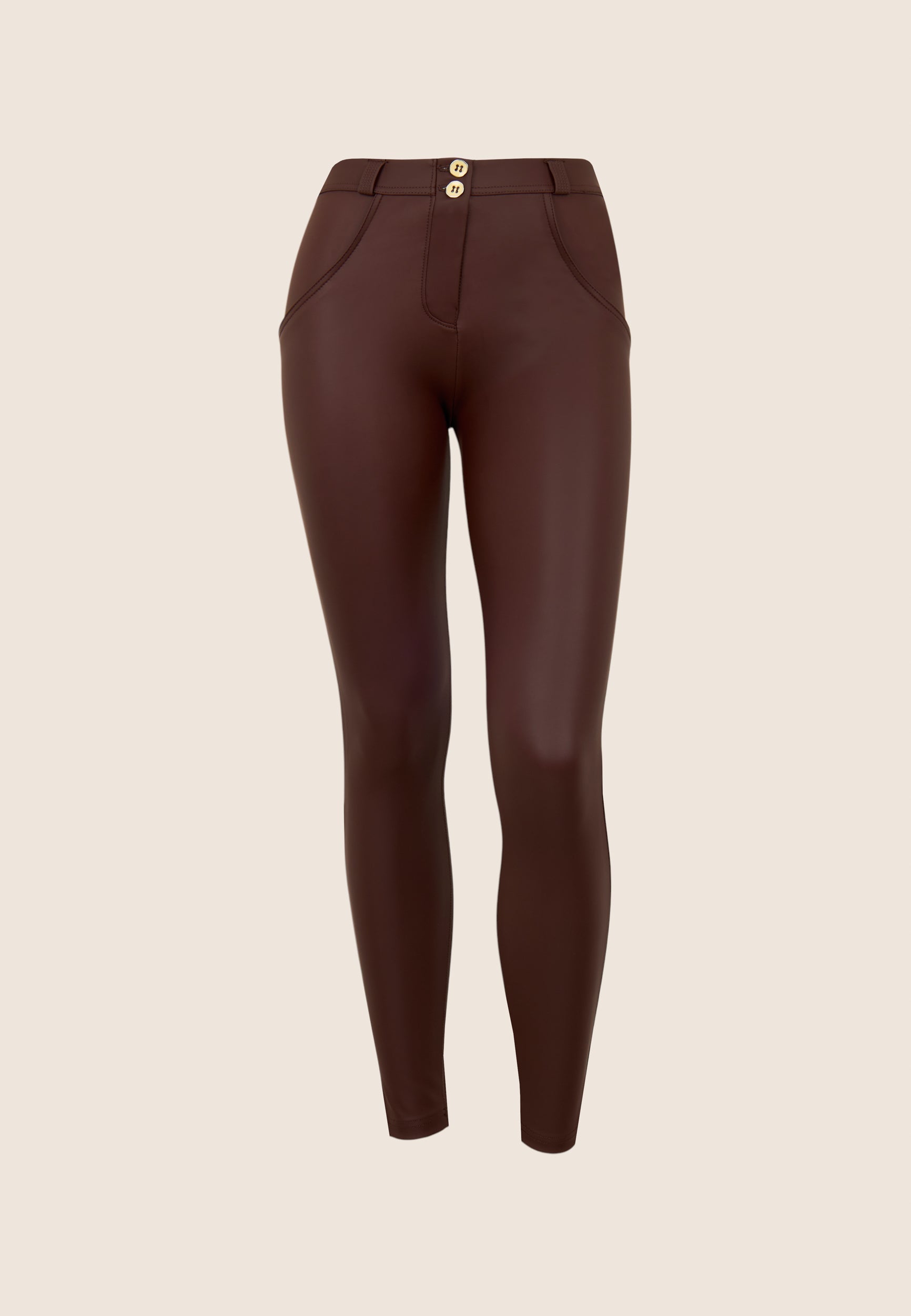 WR.UP® superskinny push up trousers in stretch eco-friendly faux leather produced using recycled material, ideal for giving a voice to your femininity without compromising freedom of movement. The model has a regular waist with belt loops, two-button fastening, regular length and superskinny fit for maximum adherence to the figure.