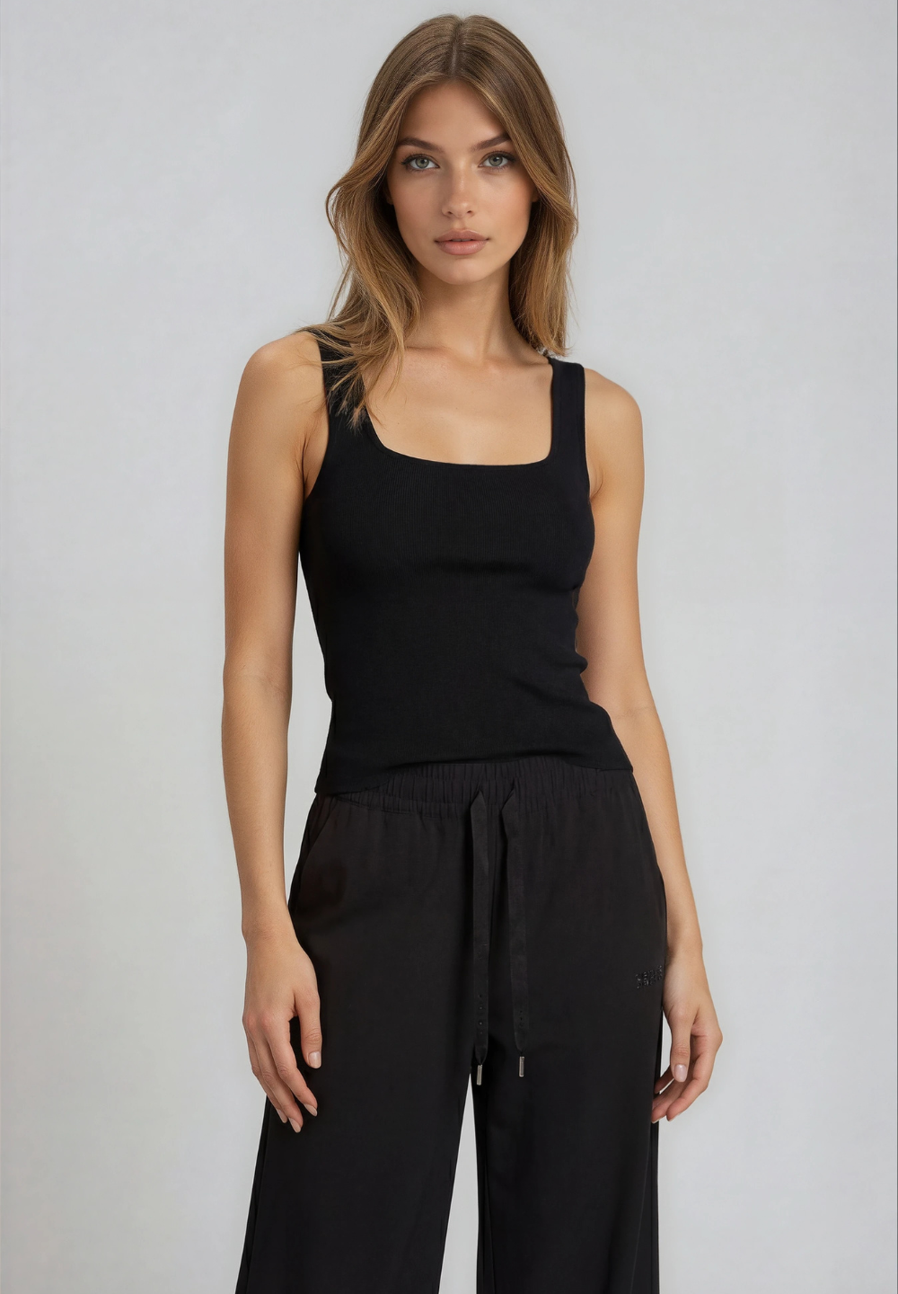 Athletic trousers with comfort fit and cropped length, featuring a regular waist with inner elastic and drawstring. The wide leg gives a relaxed and modern look. The FREDDY logo, made of matching rhinestones, is located on the left side, adding a touch of brightness. Slant pockets complete the functional design. The fabric, with a silky glossy finish, combines the softness of modal with a light and breathable structure, perfect for elegant and fresh garments.