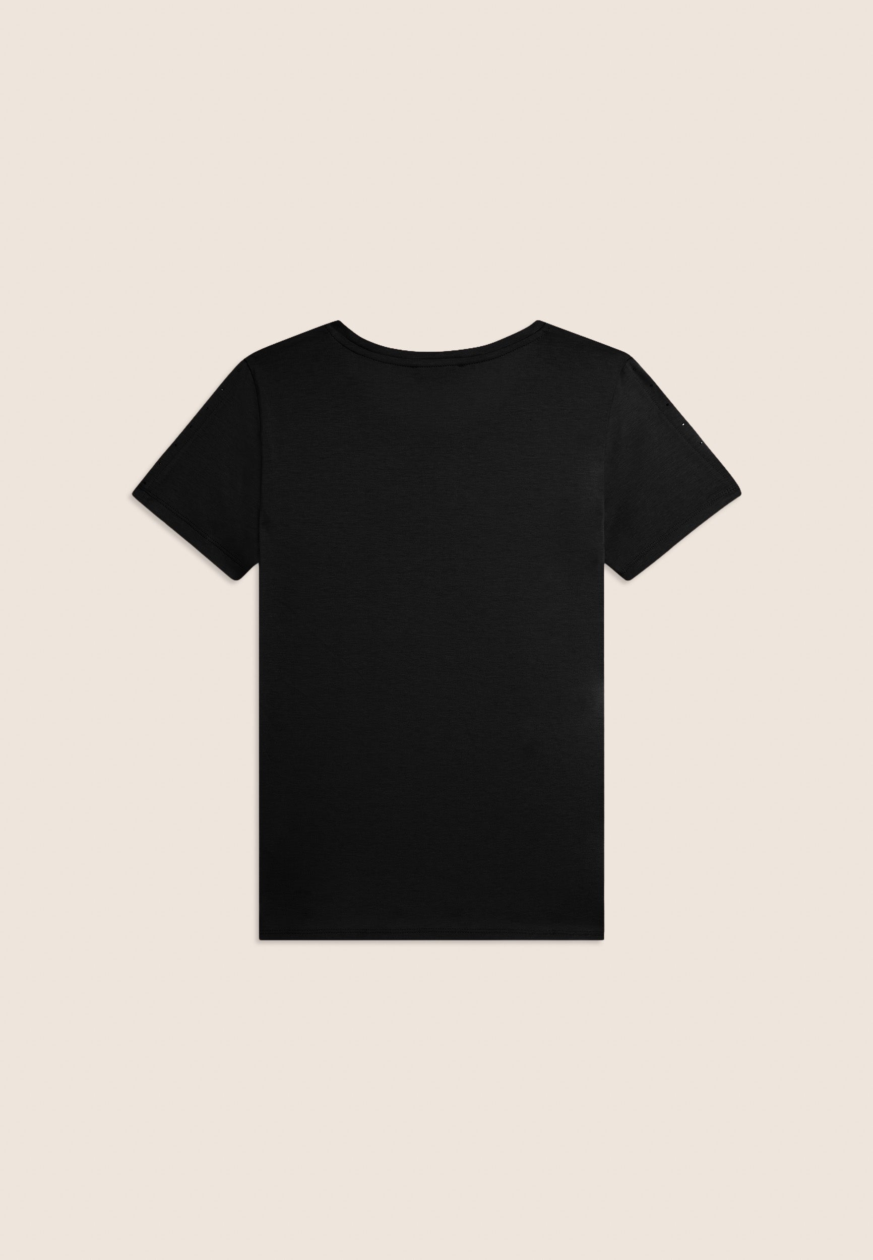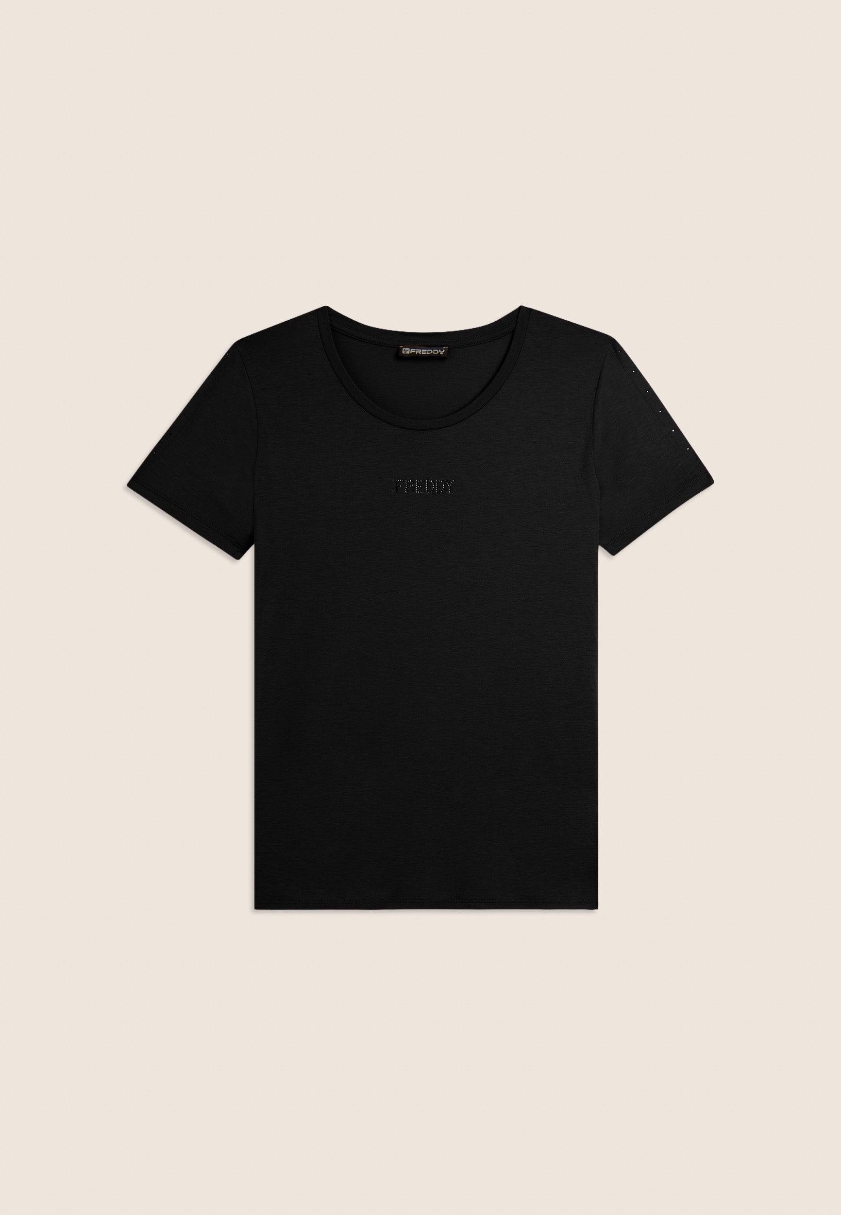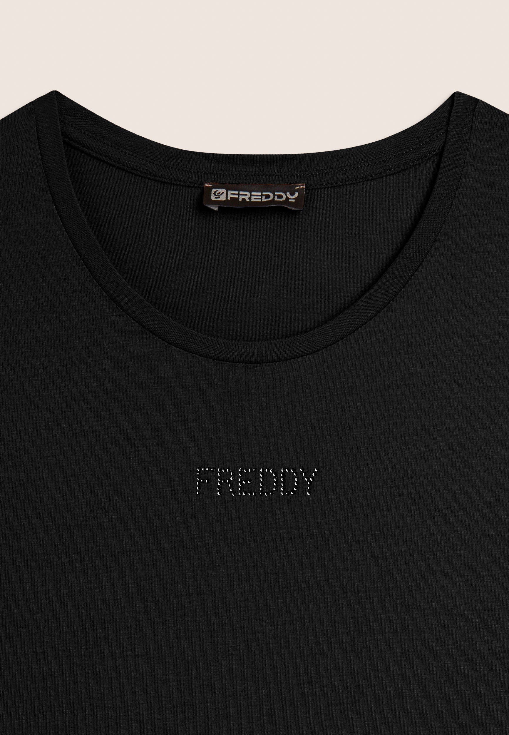 Short sleeve t-shirt with regular fit and length, featuring rounded hem on the sides. Crew neck and short sleeves with an elegant cut-out detail, edged with rhinestones. The FREDDY logo, made of colour-toned rhinestones, is located under the neckline, giving brightness to the garment. The cotton and modal jersey fabric offers softness, breathability and a smooth, light texture, ideal for a fresh, sophisticated look.