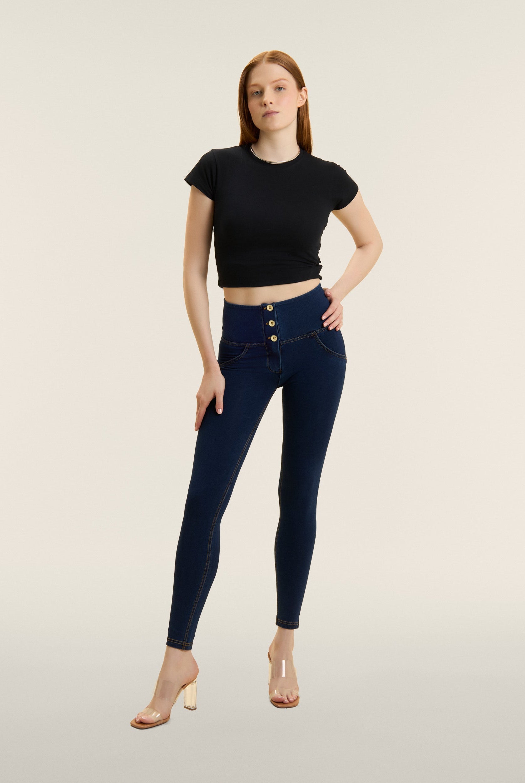 Die Mid-Waist-Modelle sitzen zwischen der Taille und dem Bauchnabel. Alle unsere mittlere Jeans haben vorne drei Freddy-typische Knöpfe. Sie sind etwas höher als unsere Regular-Waist-Hosen, aber nicht ganz so hoch, wie die High-Waist-Modelle. Sie haben einen bequemen, hohen Bund ohne Silikonstreifen, und die Knöpfe sorgen für einen perfekten Sitz. Jeans in Mid Waist eignen sich vor allem für kurvigere Frauen, die mehr Stütze und Form für den Bauch und die Taille möchten. Zusätzlich zaubern die Hosen natürlich den perfekten Po.