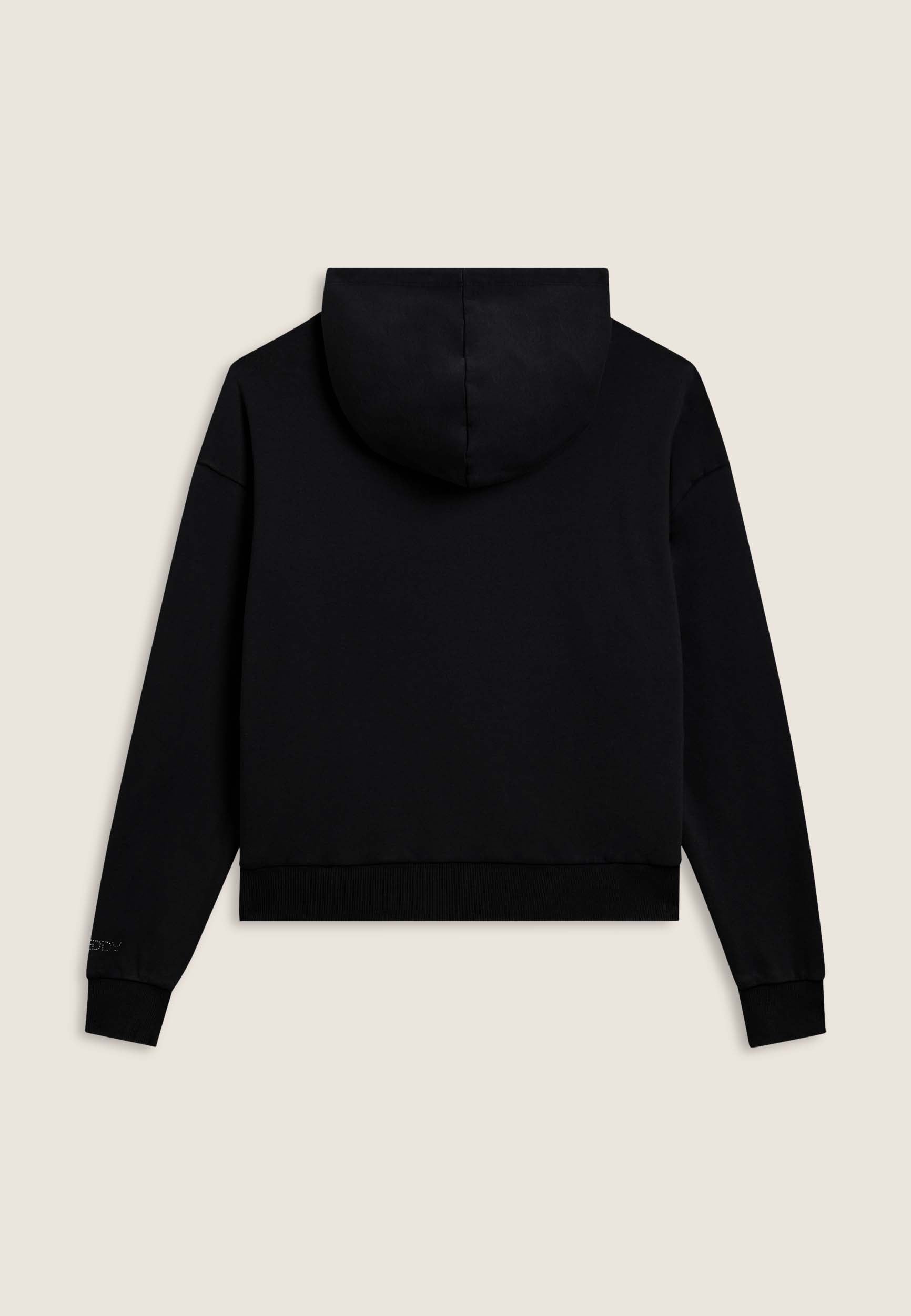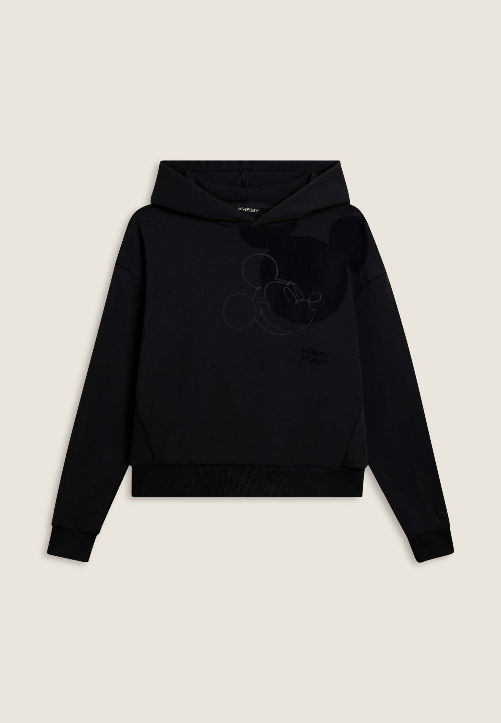 Women's comfort fit French terry sweatshirt. The jersey-lined hood is combined with dropped-shoulder sleeves and ribbed cuffs. The bottom is finished with a ribbed waistband. The large Mickey Mouse print on the front is accompanied by the small Disney logo on the back and the FREDDY logo decorated with rhinestones on the sleeve bottom. The acid wash effect gives the garment a worn look and irregular shades, making it unique.
