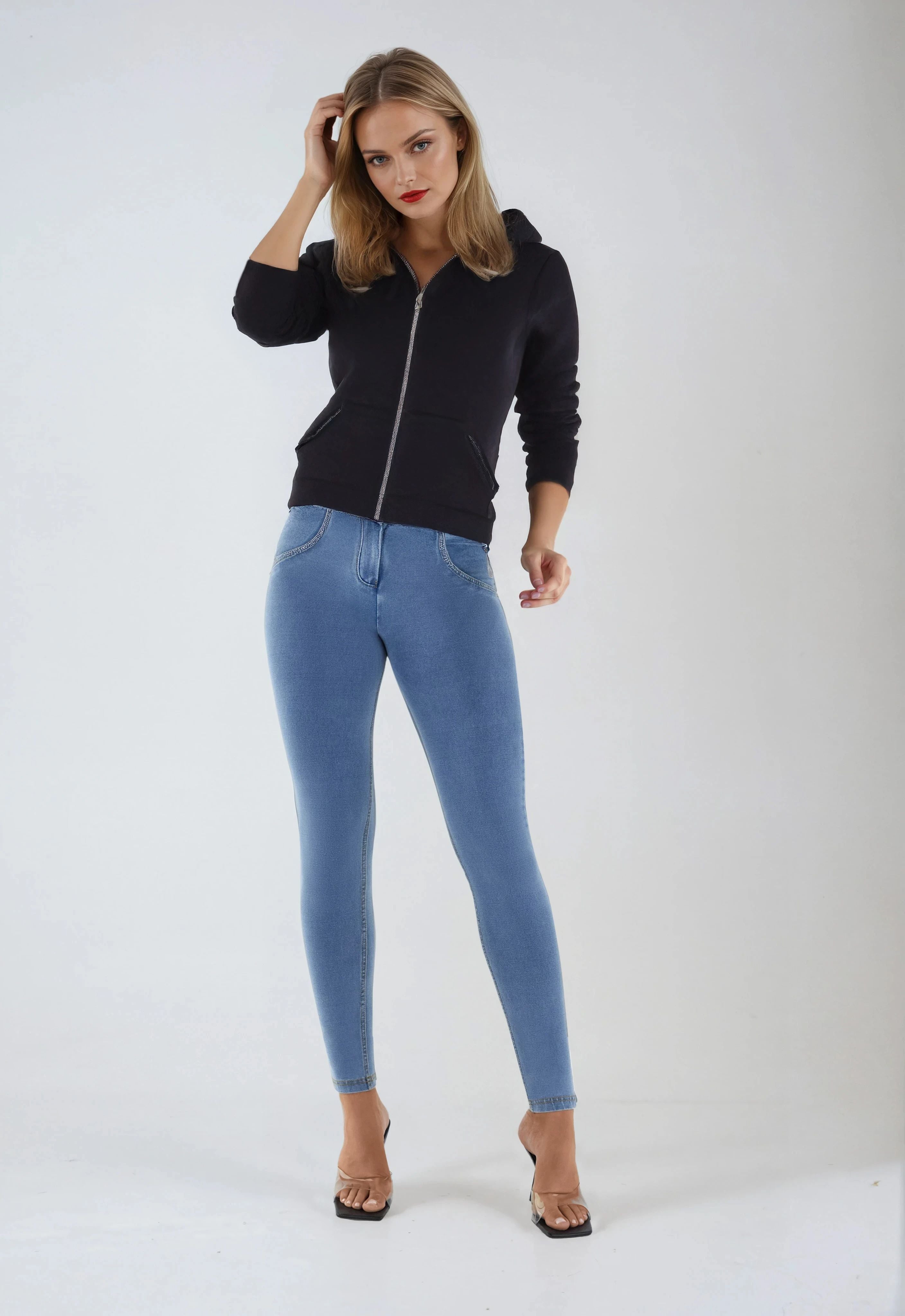 Experience the unique fit and feel of the WR.UP® Pants in Blue. It combines with a timeless full length, perfect for any season. Adding to that is a comfortable mid waist for everyday ease. The look is completed by a sleek skinny fit that hugs your curves. Crafted designed with a stretch denim-effect material for authentic style and easy movement. As part of the WR.UP® line, they feature patented technology designed to naturally enhance and sculpt your silhouette. Italian design that radiates confidence and style.