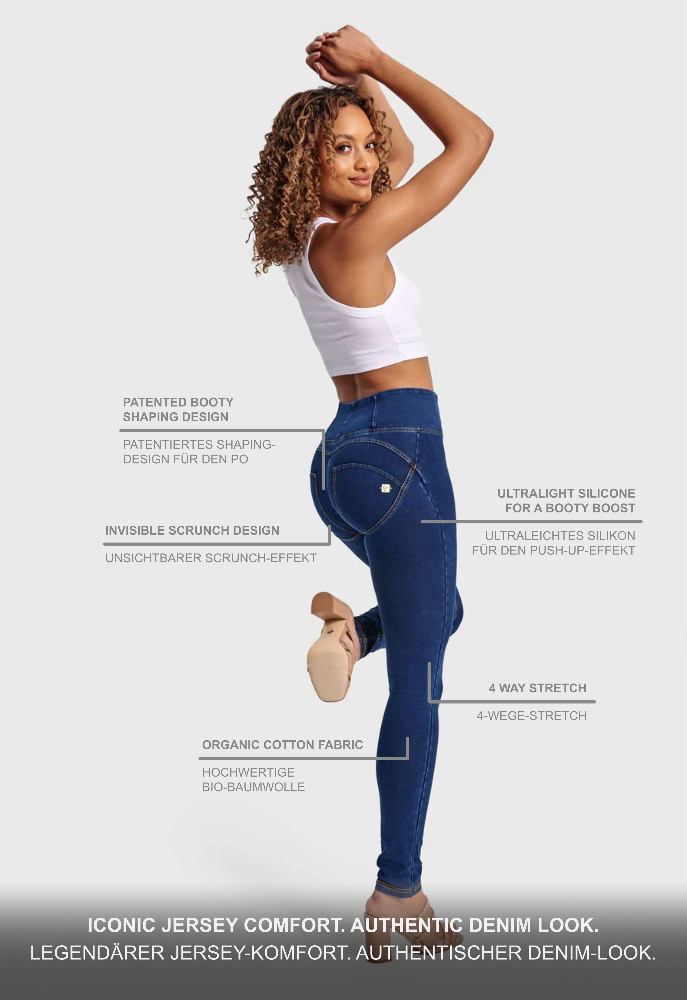 WR.UP® housut sinisenä yhdistävät ikonisen Freddy-tyylin poikkeukselliseen mukavuuteen. Ne yhdistyvät imartelevan korkeavyötäröisen mallin kanssa, joka tarjoaa lempeää tukea. Lisäksi niissä on ajaton täyspitkä malli, joka sopii täydellisesti mihin vuodenaikaan tahansa. Ulkonäön täydentää tyylikäs kapea istuvuus, joka myötäilee muotojasi. Valmistettu tarjoamaan klassinen farkkukangaslook pehmeän, joustavan kankaan mukavuudella. Osana WR.UP®-mallistoa ne sisältävät patentoitua teknologiaa, joka luonnollisesti korostaa ja muokkaa siluettiasi. Housut, jotka yhdistävät vaivattomasti mukavuuden ja muodikkaan ulkonäön.