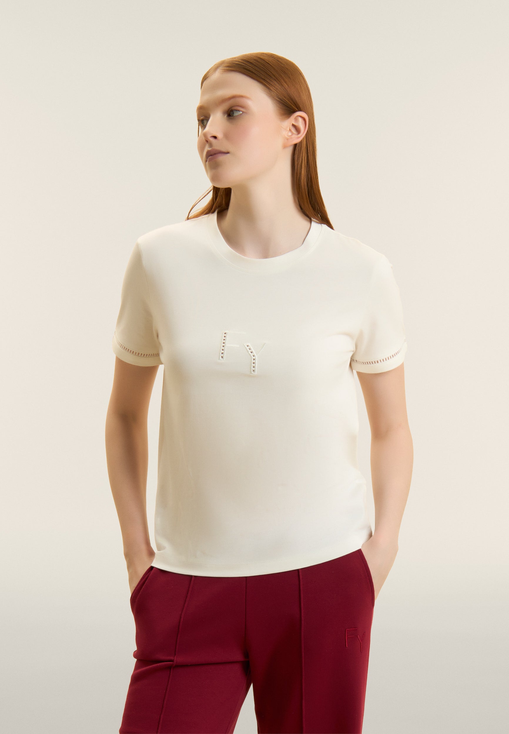 Regular-fit, standard-length t-shirt with straight hem. The minimalist design of crew neckline and short sleeves is enriched by the FY logo embroidered in a perforated form on the front, and the sleeve bottoms feature a decorative detail. A small Freddy logo is printed under the back neckline. Made of 100% cotton jersey, it guarantees comfort and breathability.