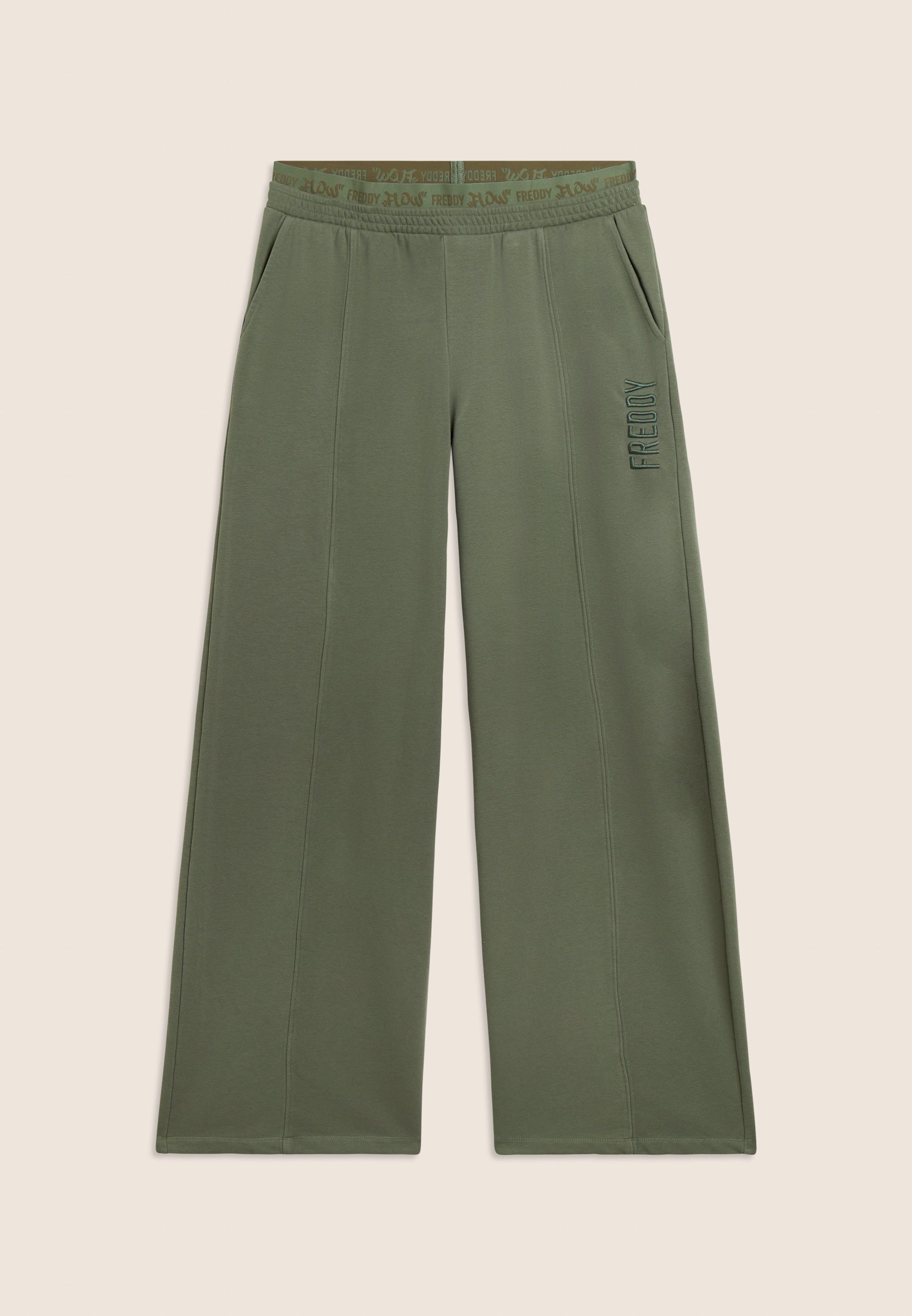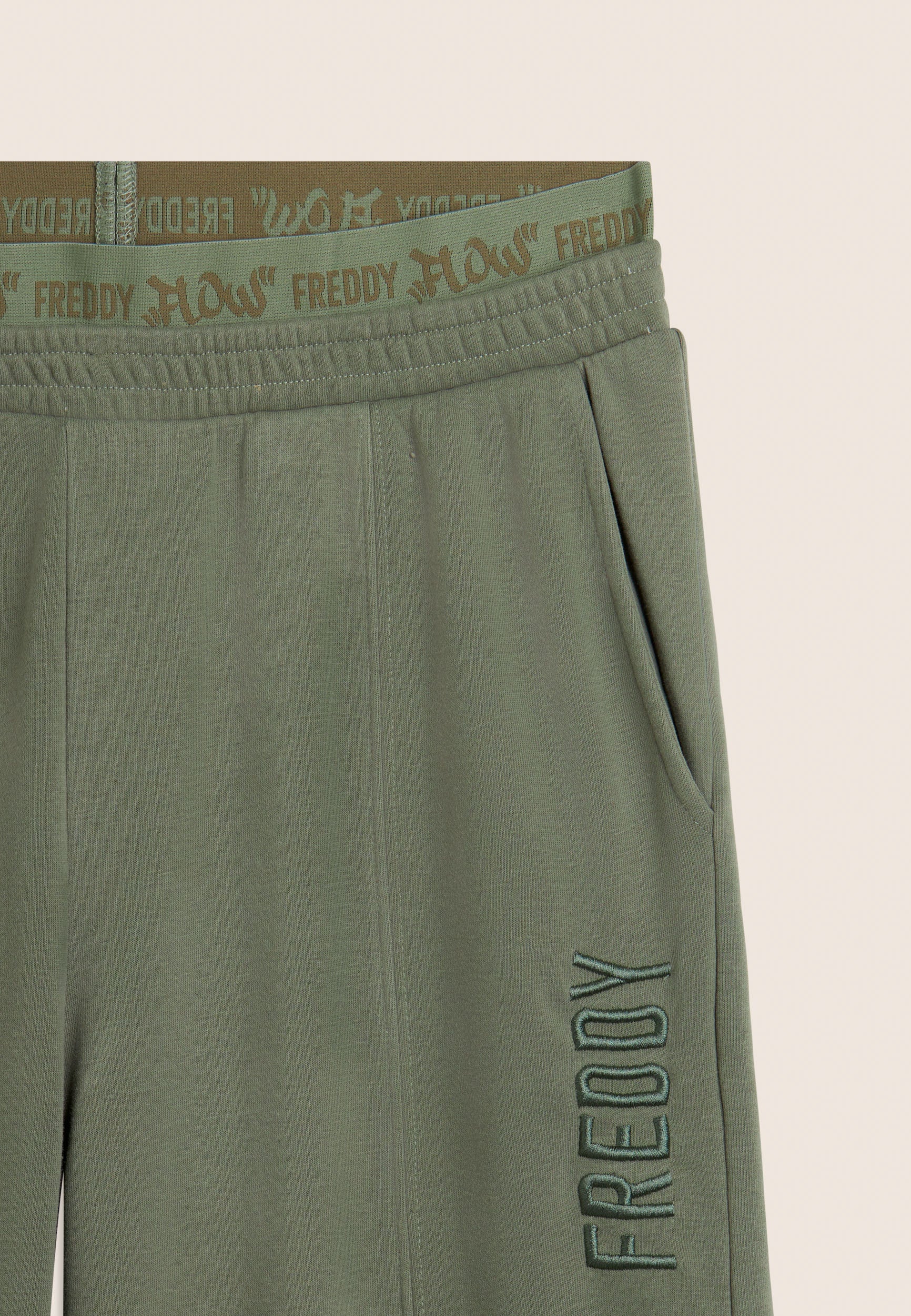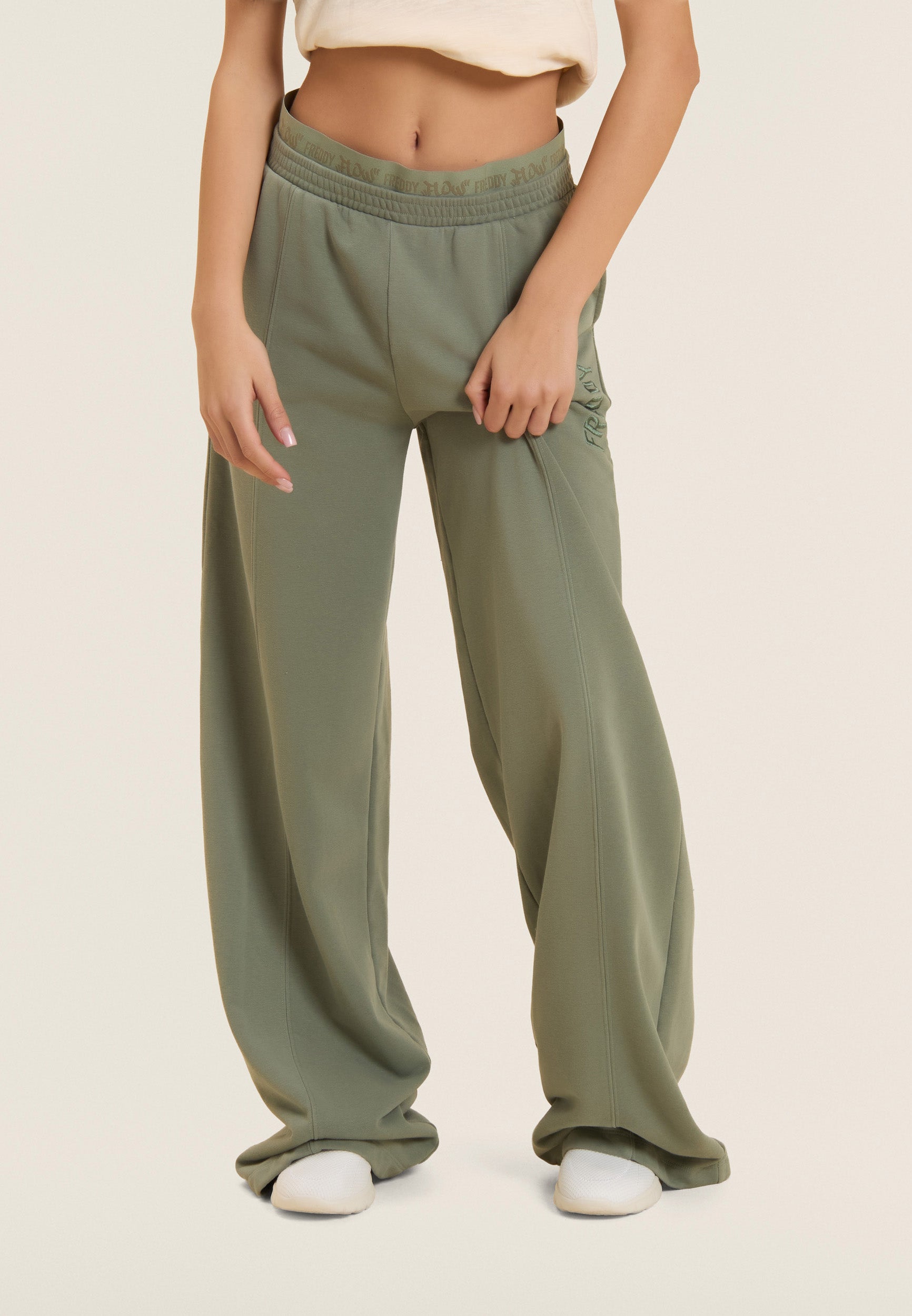 Oversized athletic trousers in enzyme-treated French terry with a wide leg and central stitching for a distinctive and dynamic look. The regular waist with internal elastic and the street art-style 'FREDDY FLOW' graphic decorate the garment, adding a bold visual touch. Tone-on-tone embroidered logo on the left side Soft and durable, these trousers offer maximum comfort for those who love urban style and movement.