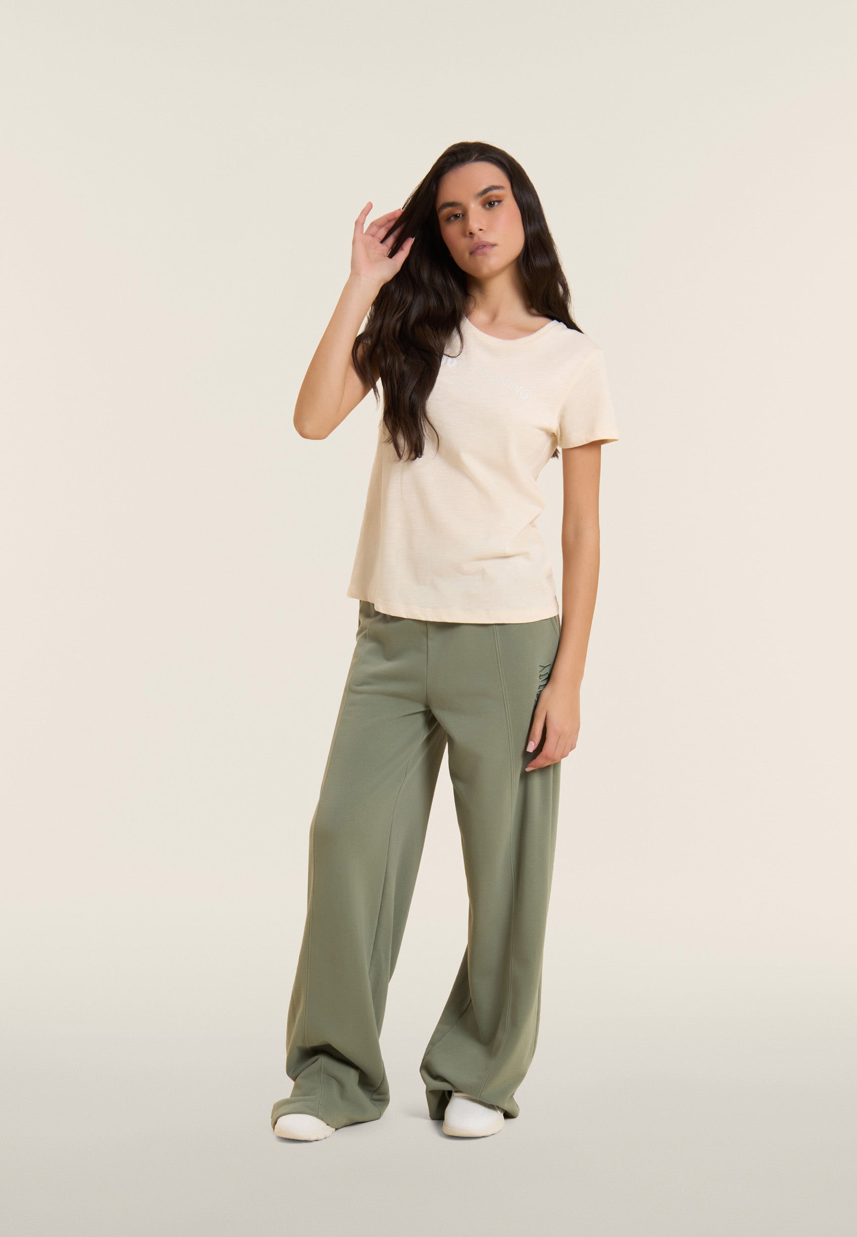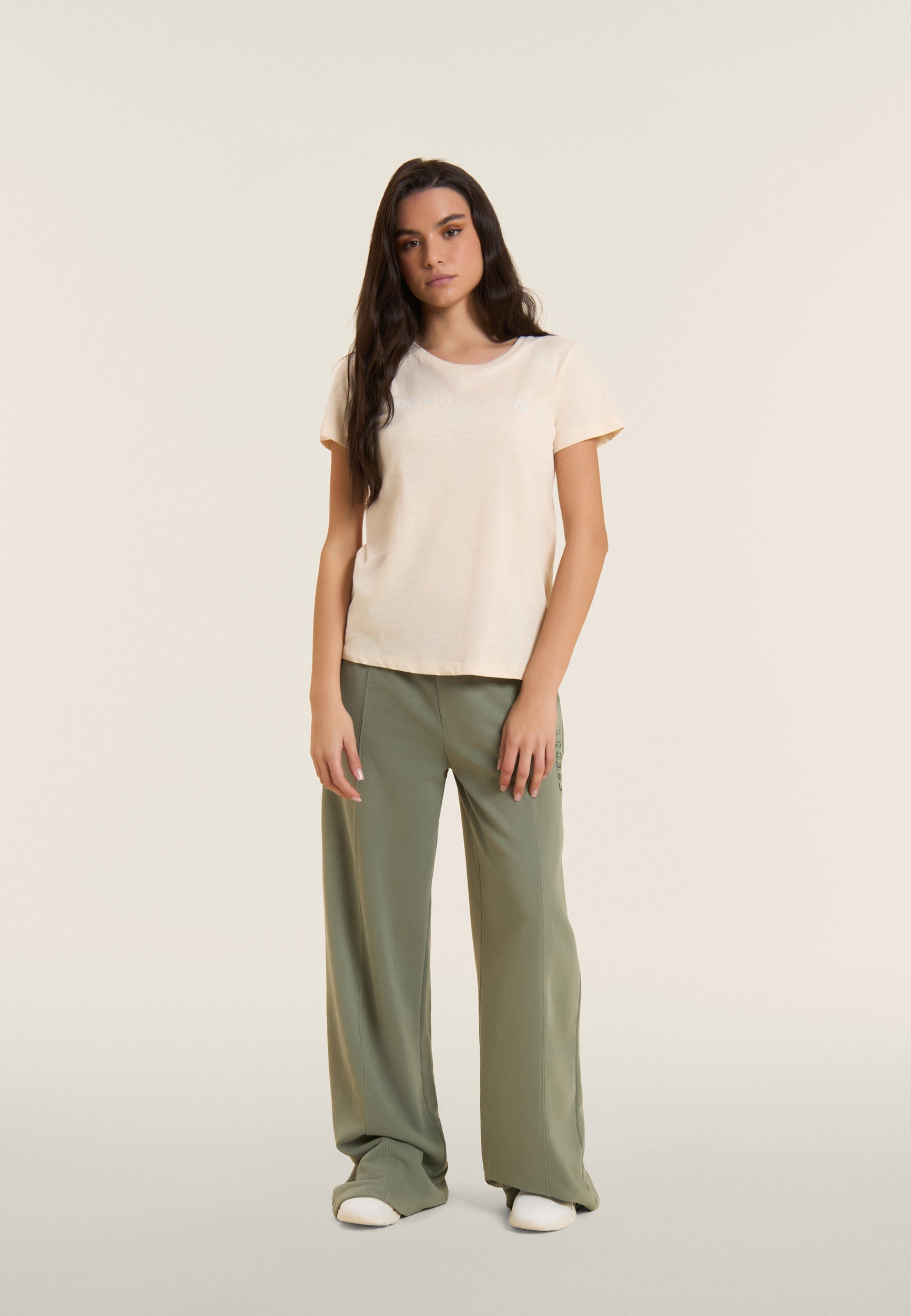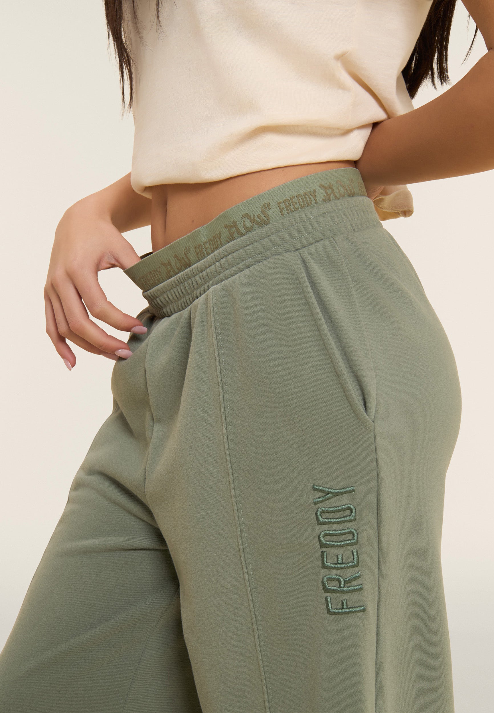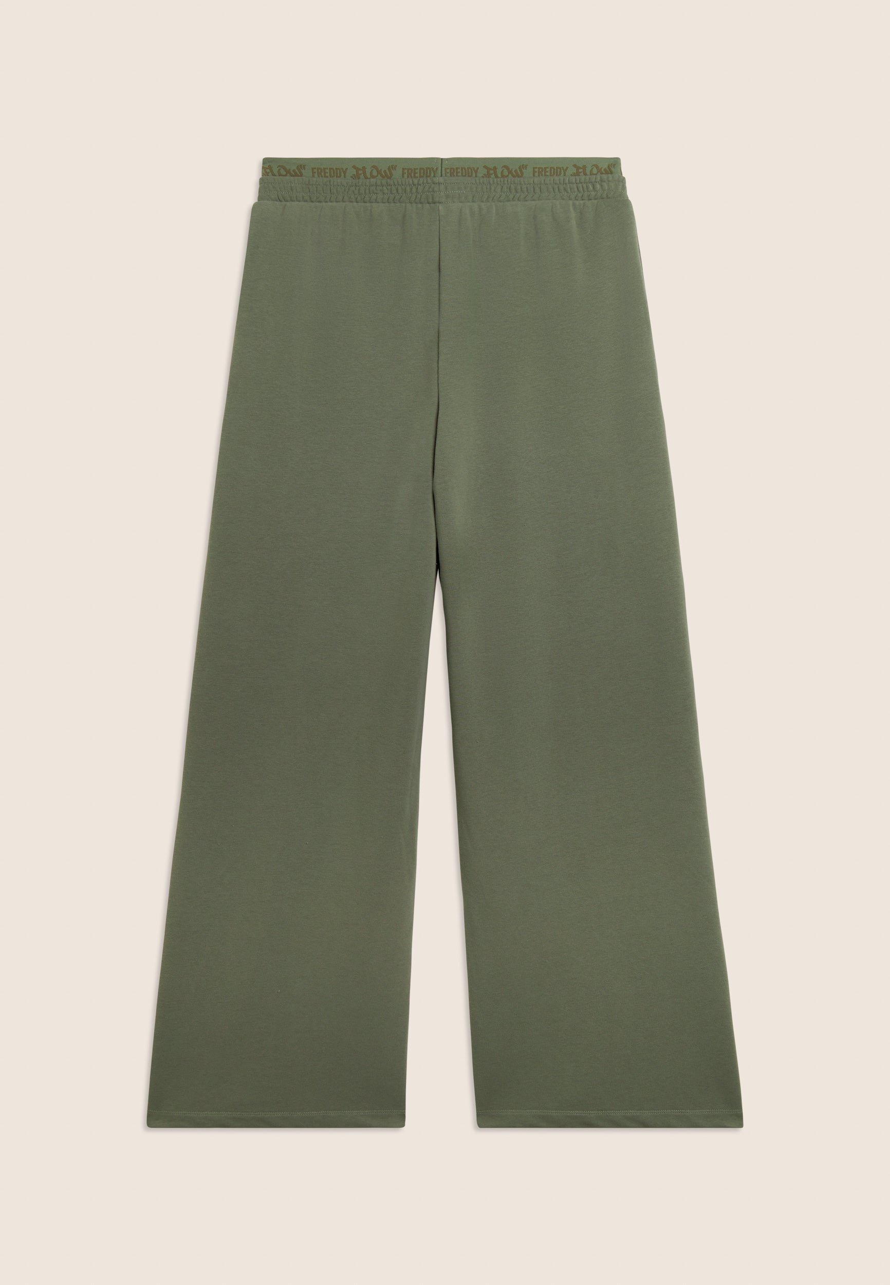 Oversized athletic trousers in enzyme-treated French terry with a wide leg and central stitching for a distinctive and dynamic look. The regular waist with internal elastic and the street art-style 'FREDDY FLOW' graphic decorate the garment, adding a bold visual touch. Tone-on-tone embroidered logo on the left side Soft and durable, these trousers offer maximum comfort for those who love urban style and movement.