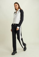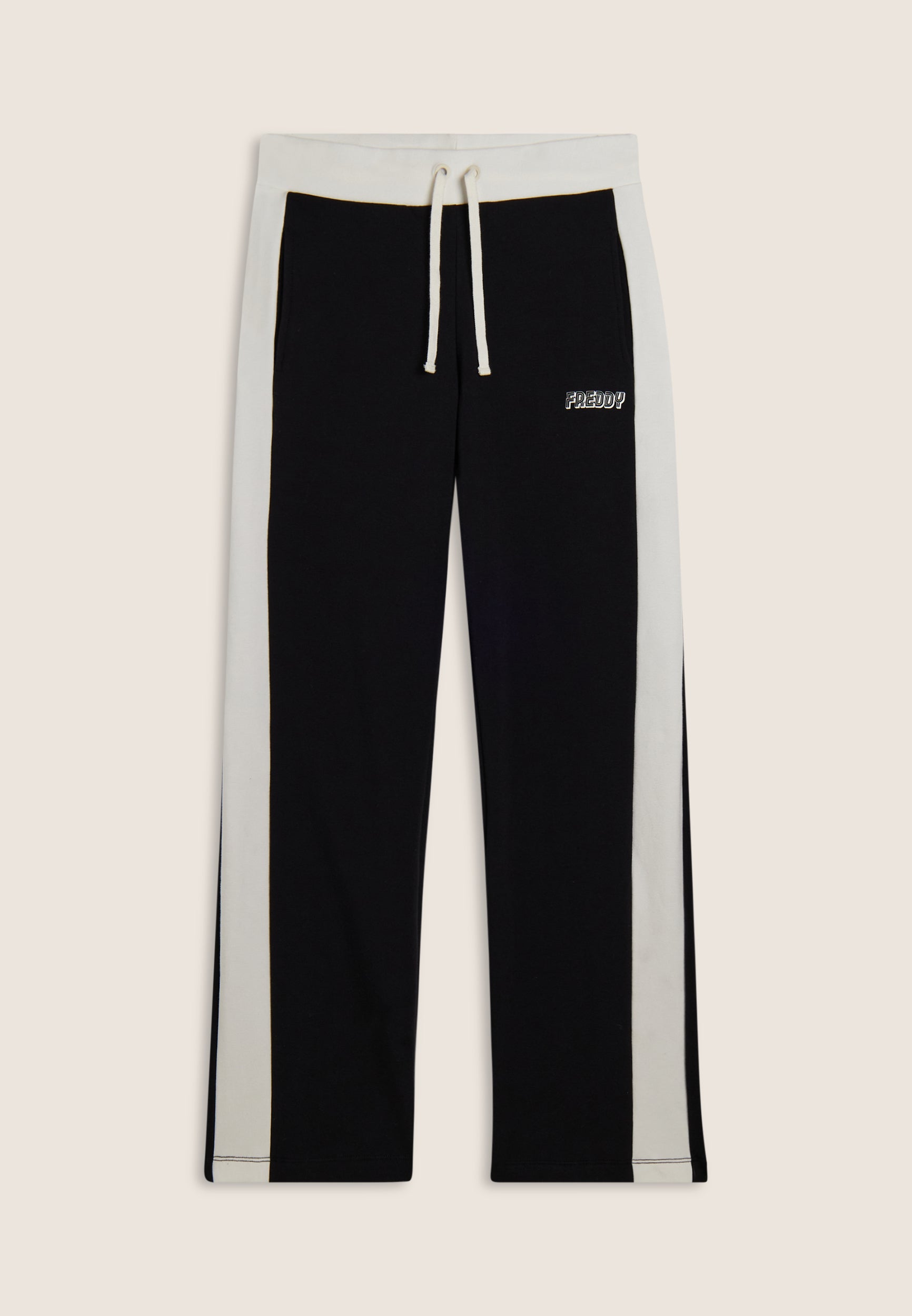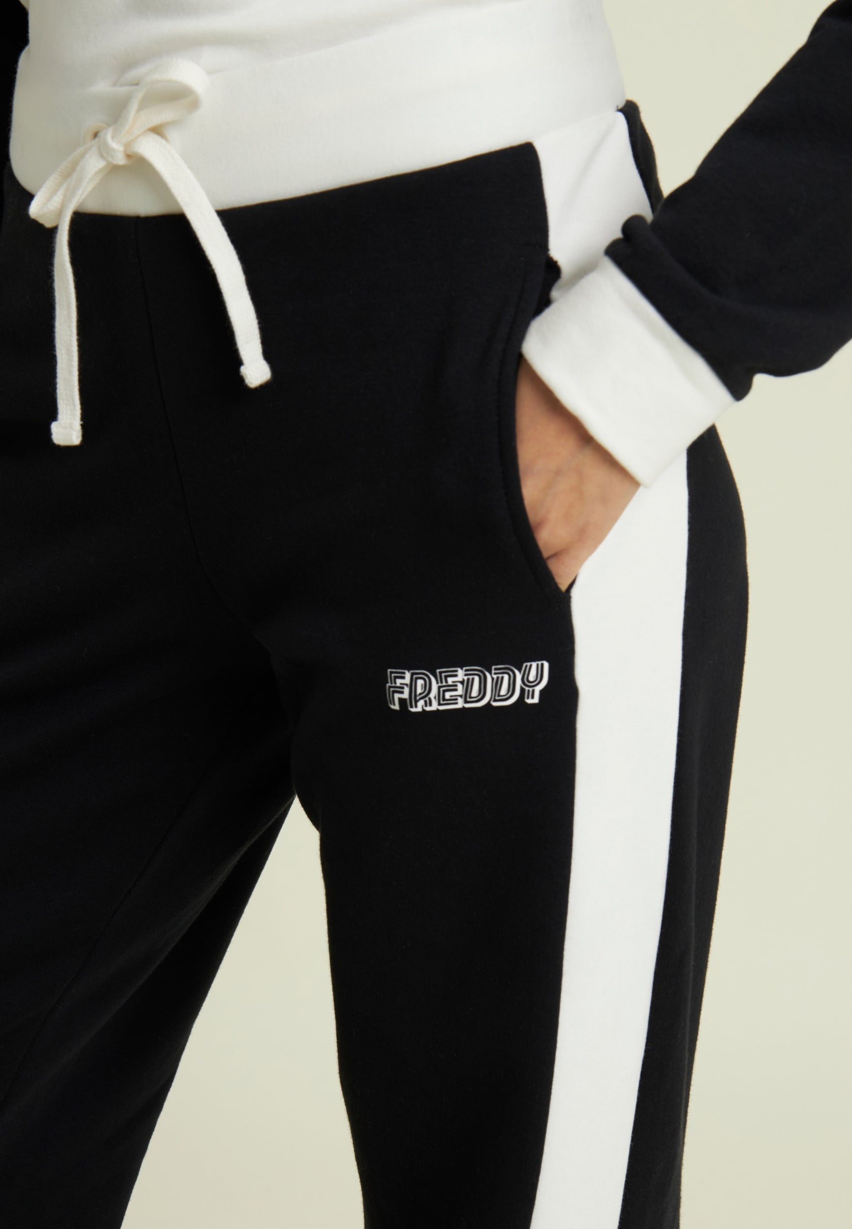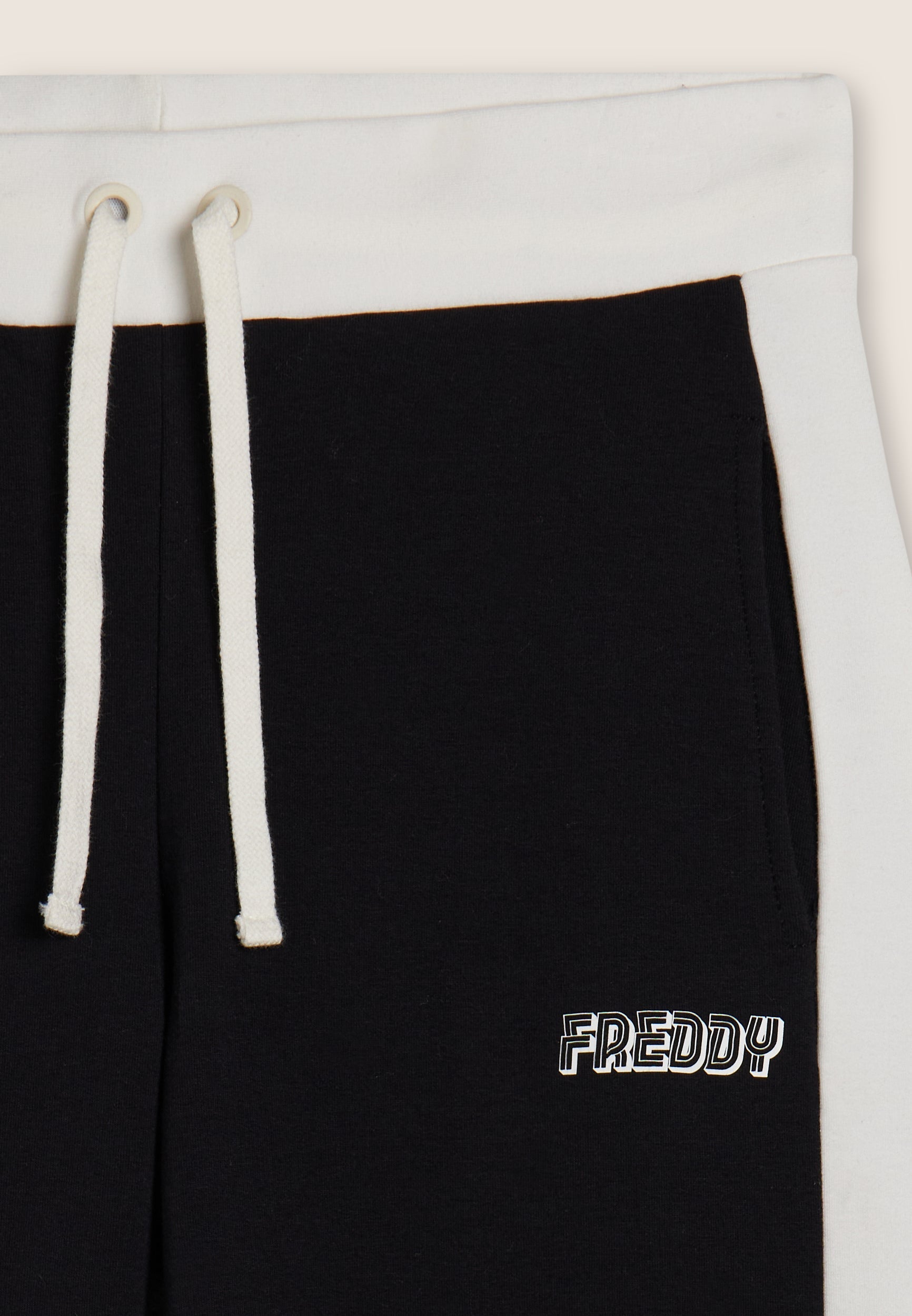 Classic and street styles come together in these regular fit black stretch fleece trousers. White side bands and a colour-contrast drawstring belt add character to the look, while the comfort fit makes them perfect for leisure time. Two-tone FREDDY logo and welted pockets complete a versatile and super urban garment.