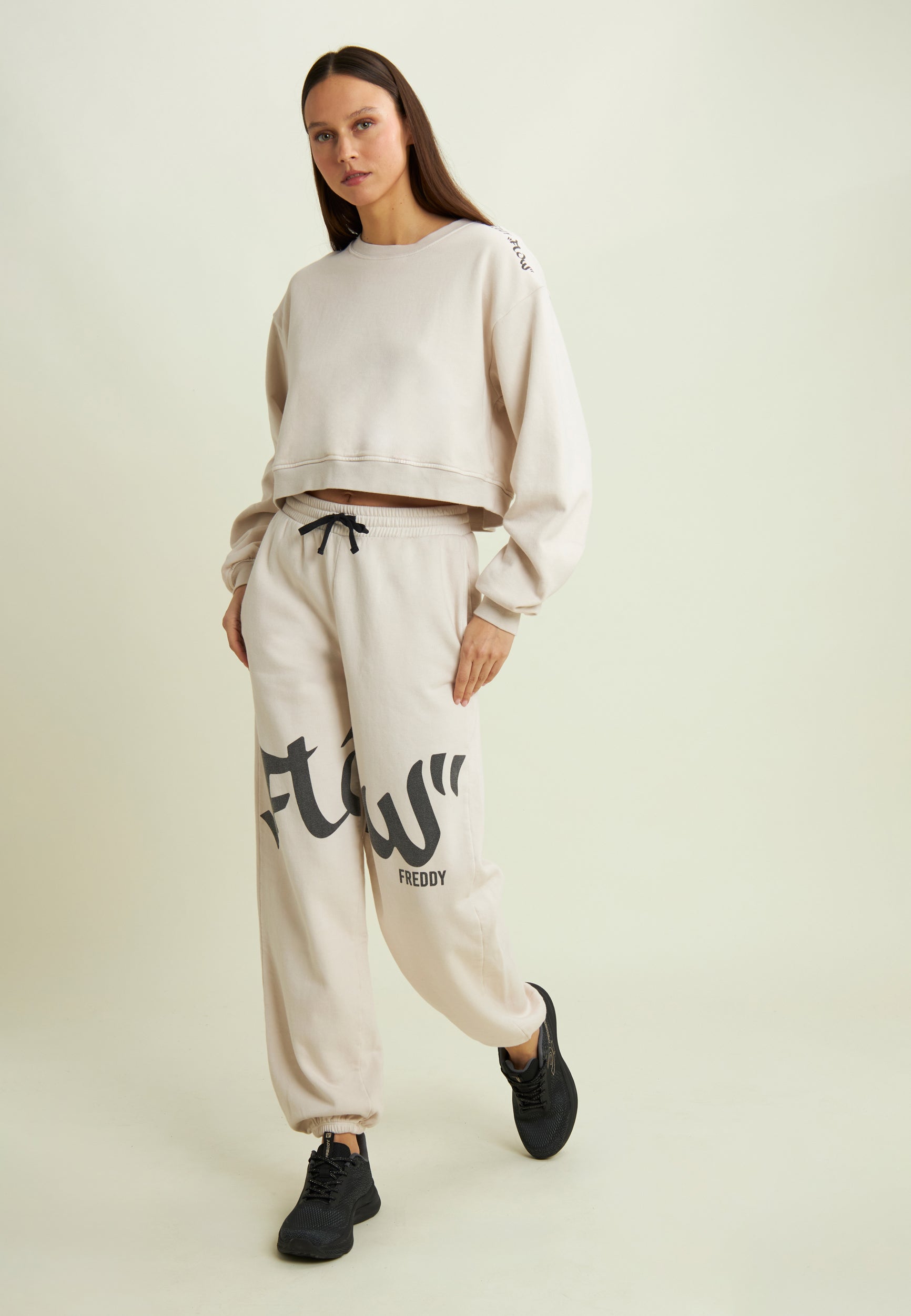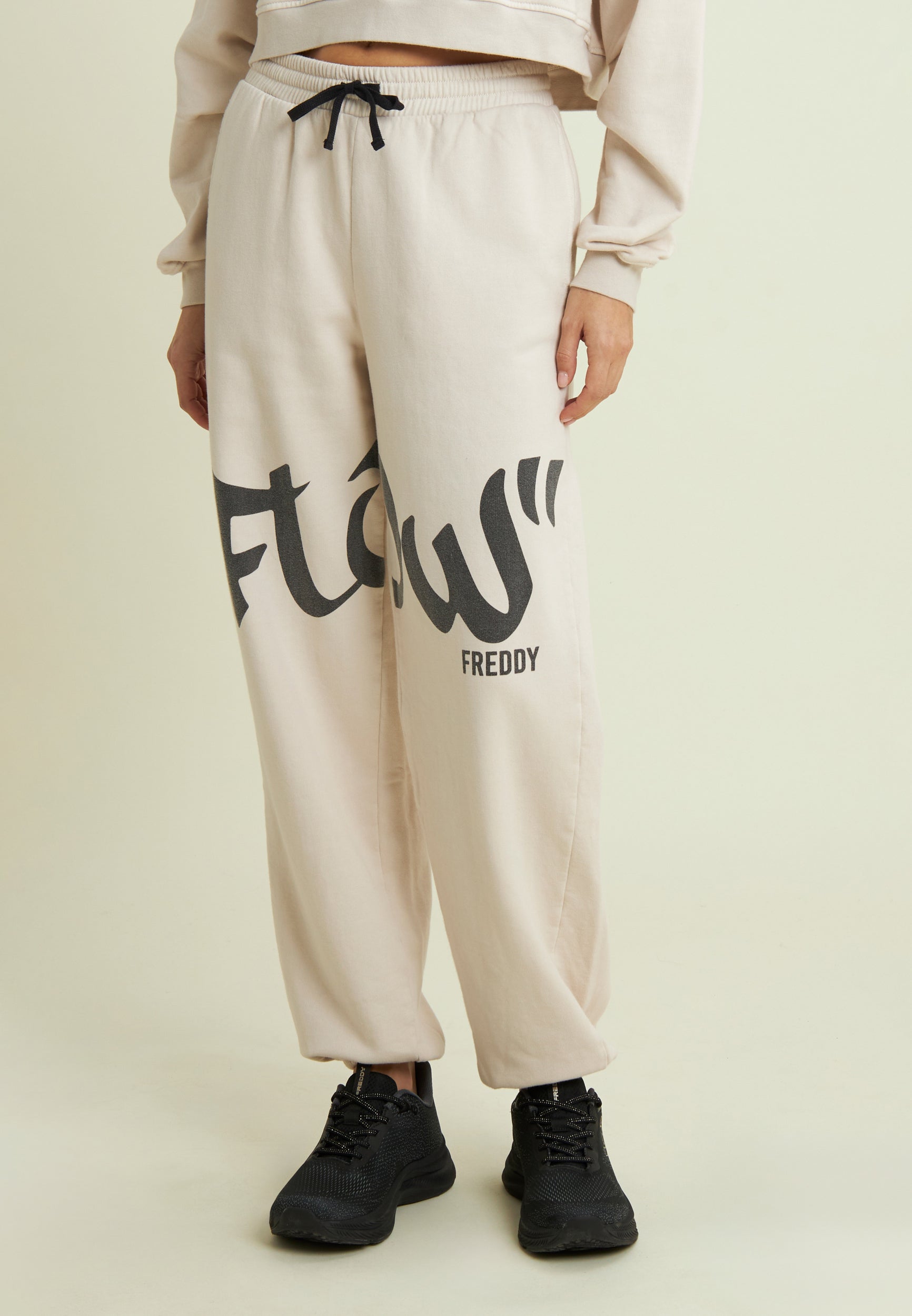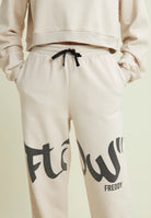 Absolute comfort and street style come together in these fleece trousers with relaxed fit and extra length. The elasticated leg bottoms create a super cool gathered effect, while the “Flow” print across the legs gives a unique touch of street art. The brushed fabric, treated with enzymes, makes the colours more intense and the sweatshirt incredibly soft. Regular waist with drawstring and practical besom pockets: ideal for a comfy yet confident look.