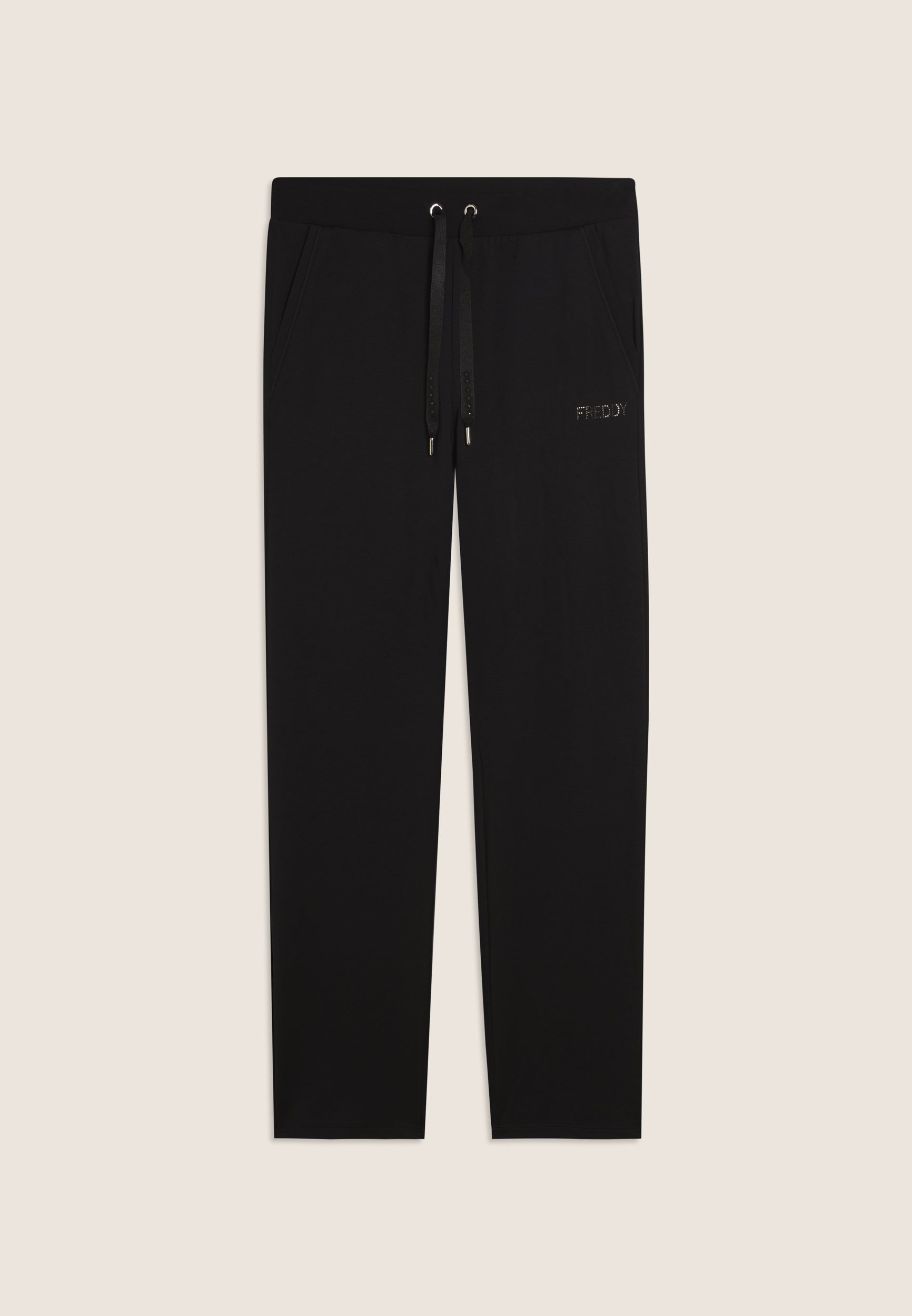 Athletic trousers with a regular fit and length, featuring a regular waist with a ribbed band and drawstring for a comfortable fit. The straight leg guarantees a clean, modern silhouette. The FREDDY logo in colour-tone rhinestones on the left side adds a touch of brightness to the garment. Slant pockets with decorative piping on the opening complete the look. The French terry fabric, consisting of modal and cotton with elastane, is soft, breathable and perfect for dynamic comfort.