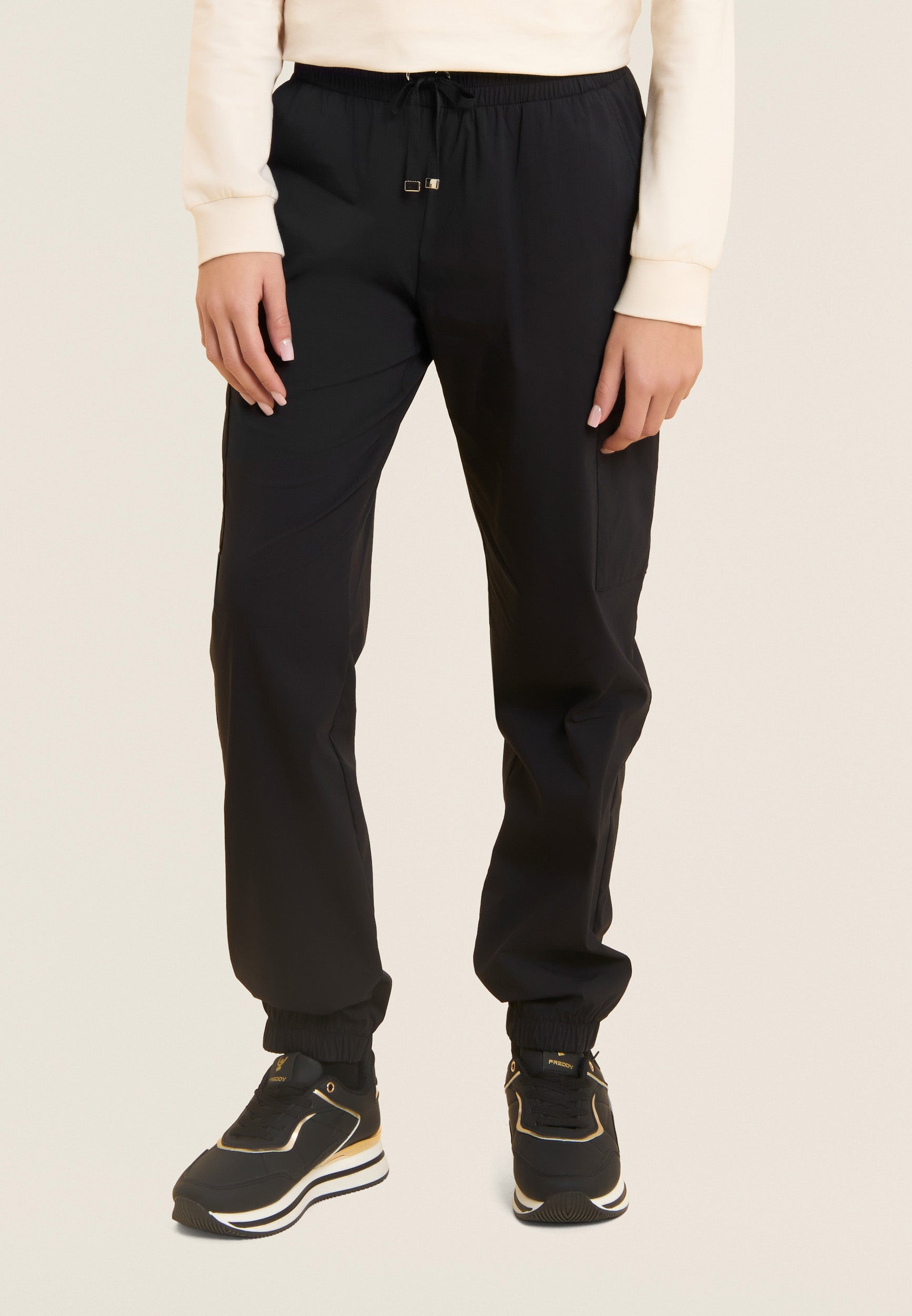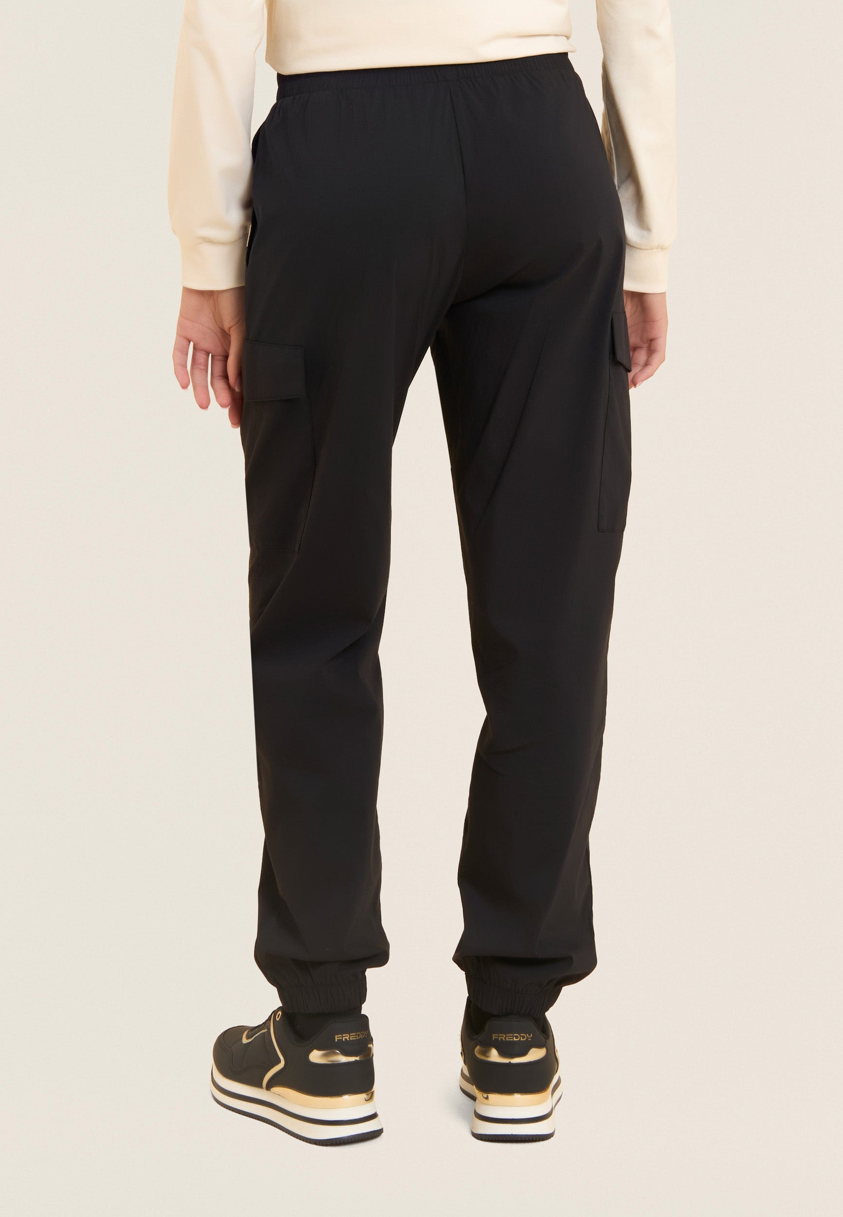 Regular-fit cargo trousers with a regular waist and drawstring and inner elastic for a gathered effect. The bottom is finished with internal elastic. Side flap pockets on the outer thighs and slant besom pockets add functionality and style. An exclusive detail is the golden FREDDY logo tab on the left pocket opening. Made of stretch poplin, these trousers are light and easy to wear, offering a perfect combination of comfort and sophistication.