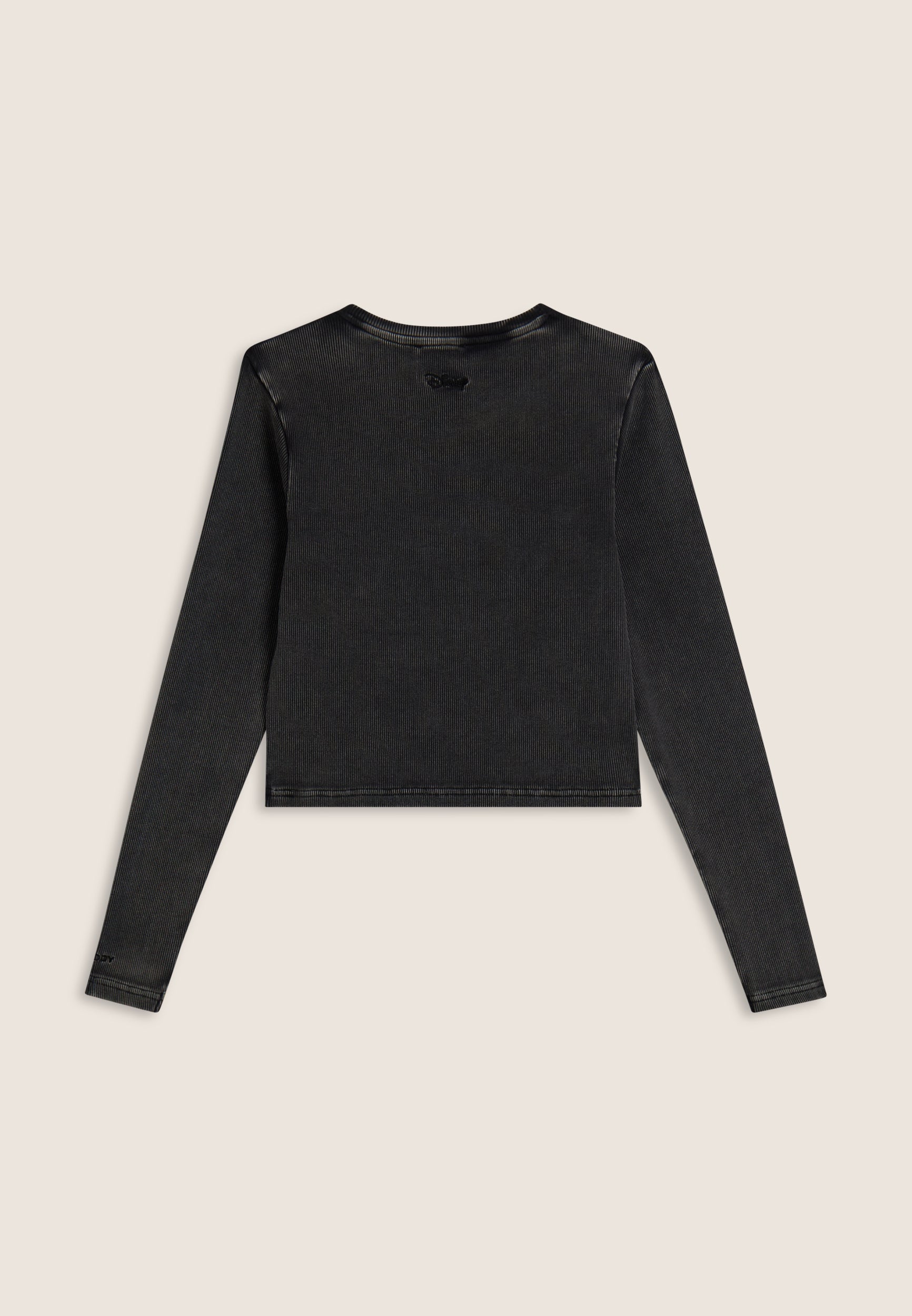 Long-sleeved T-shirt with cropped cut and slim fit, made from ribbed cotton with acid wash effect treatment for a natural, worn and faded look. The front is embellished with tone-on-tone Mickey Mouse embroidery, accompanied by a small Disney logo and the FREDDY logo on the sleeve bottom, both embroidered.