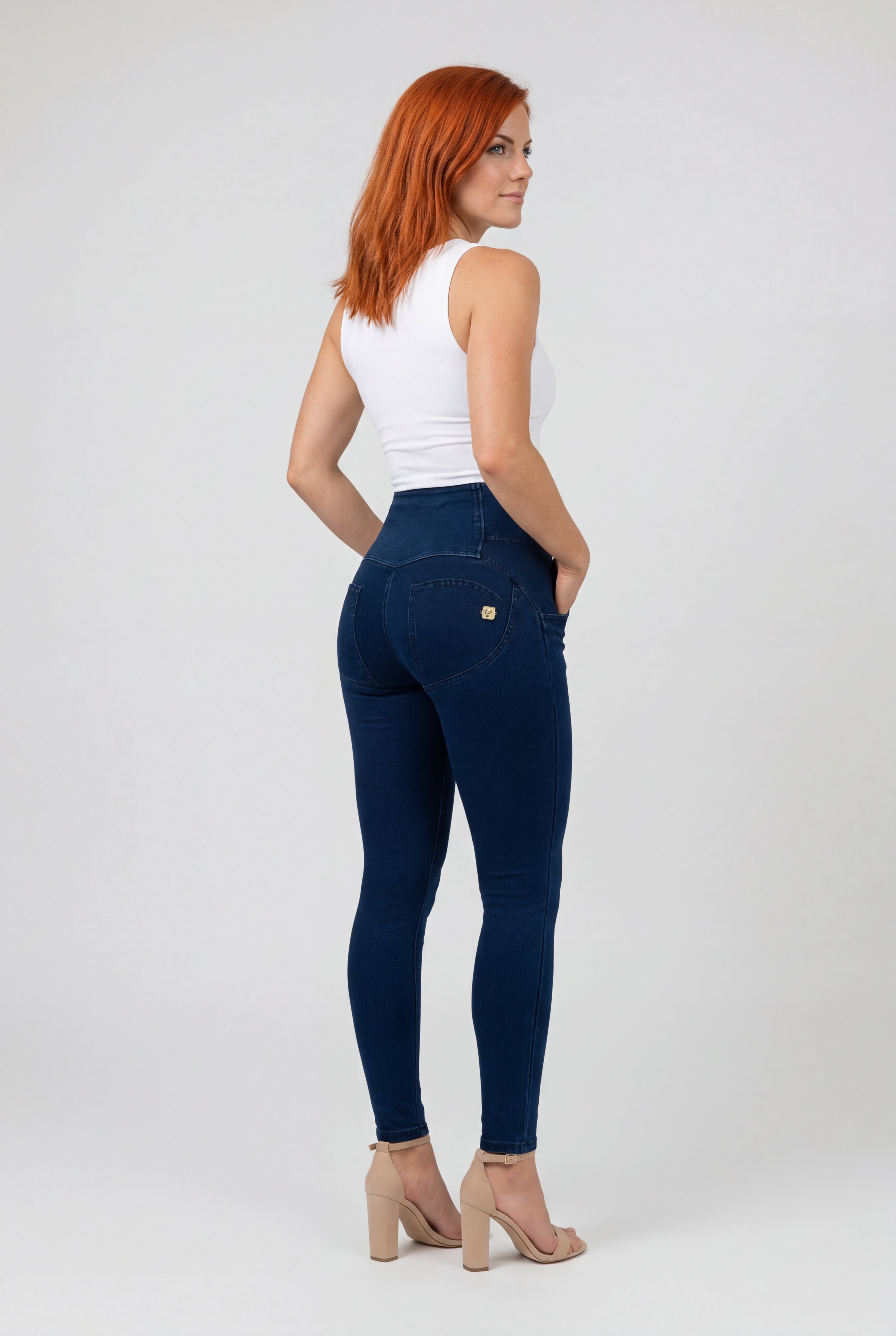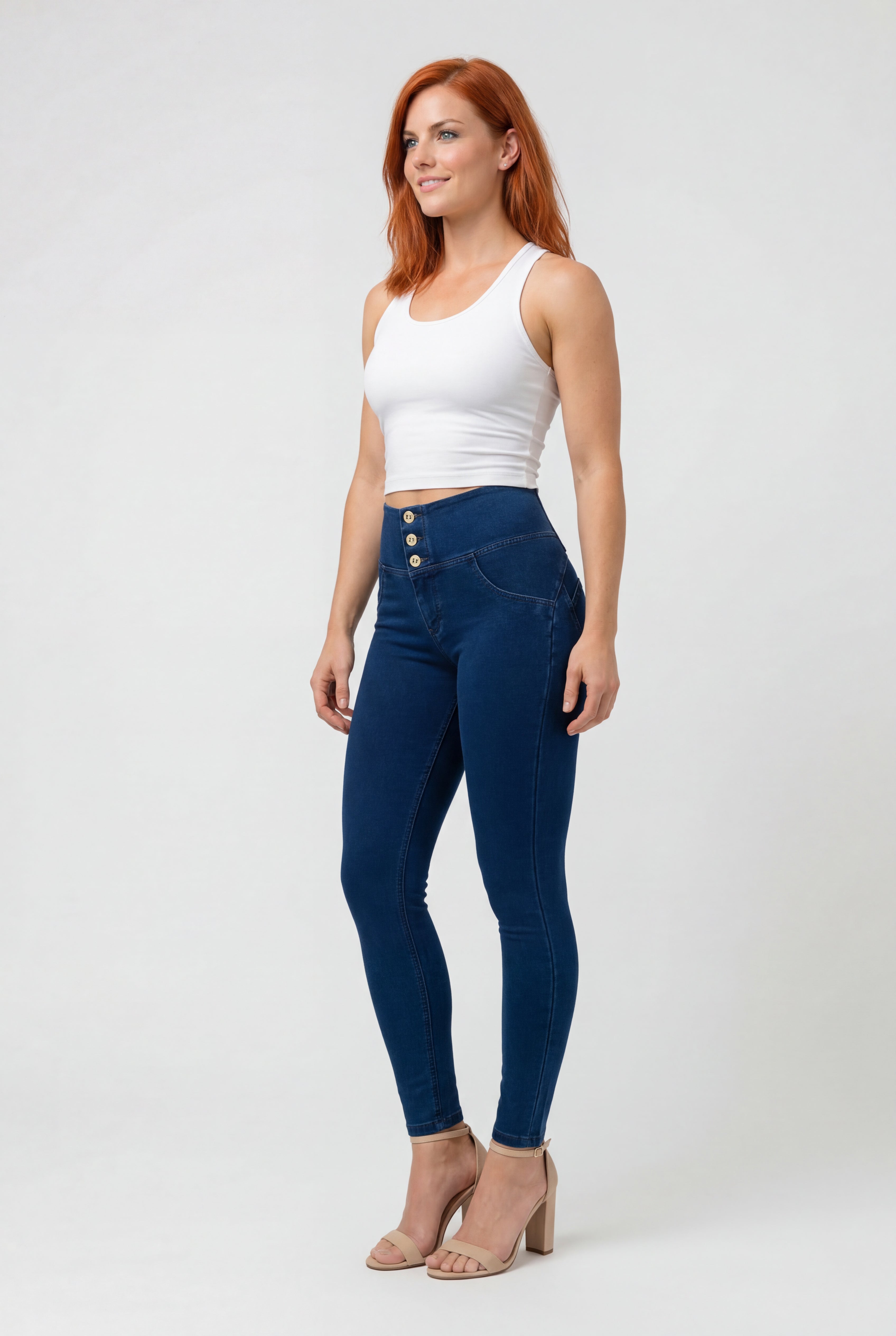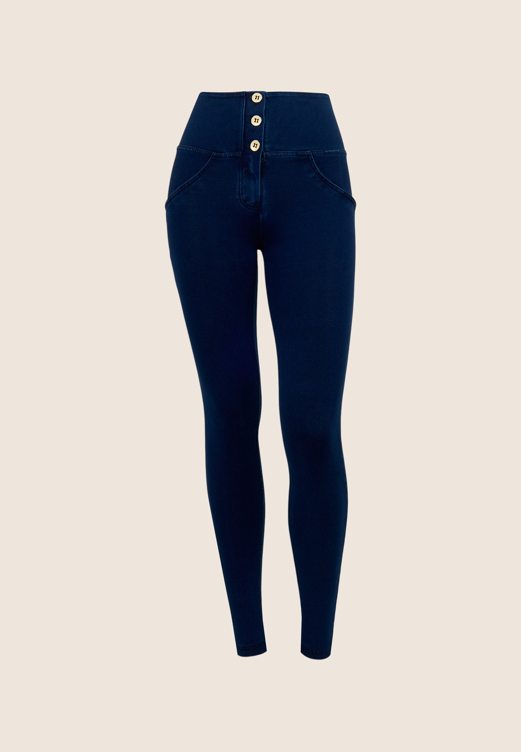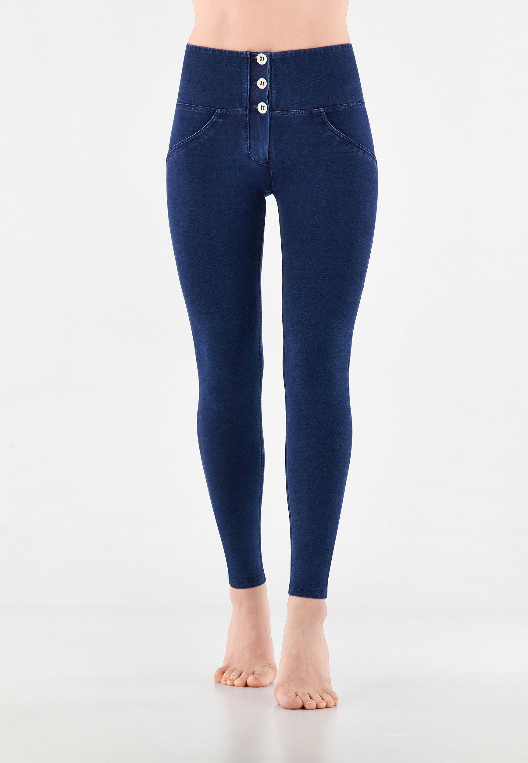 WR.UP Push-Up Button High Waist Skinny Denim Jeans - Denim Dark Blue - Blue Seam