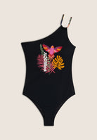 Ein-Schulter Badeanzug mit Aufdruck - BLACK