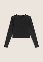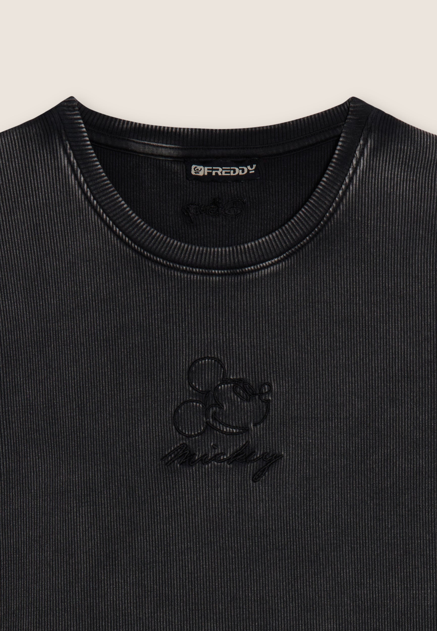 Long-sleeved T-shirt with cropped cut and slim fit, made from ribbed cotton with acid wash effect treatment for a natural, worn and faded look. The front is embellished with tone-on-tone Mickey Mouse embroidery, accompanied by a small Disney logo and the FREDDY logo on the sleeve bottom, both embroidered.